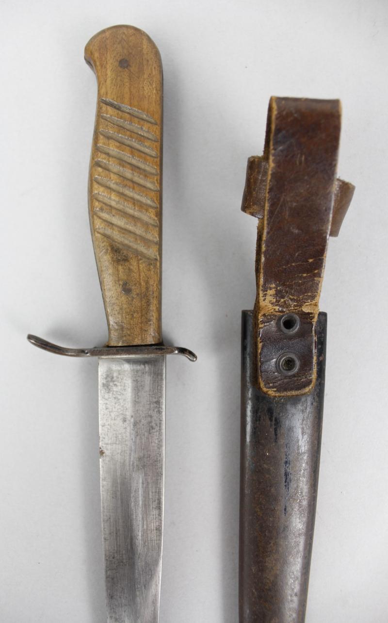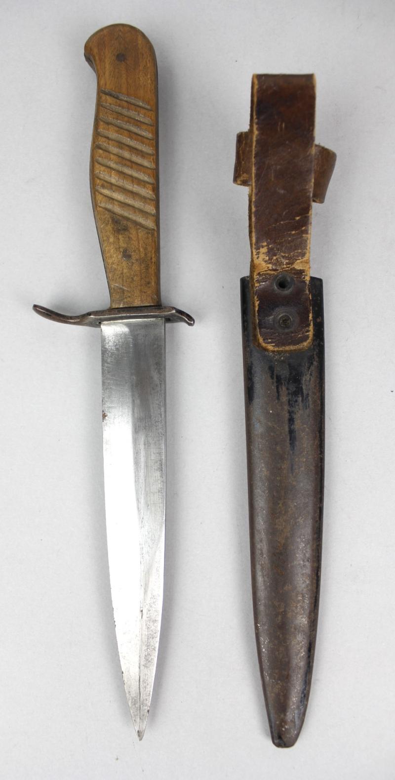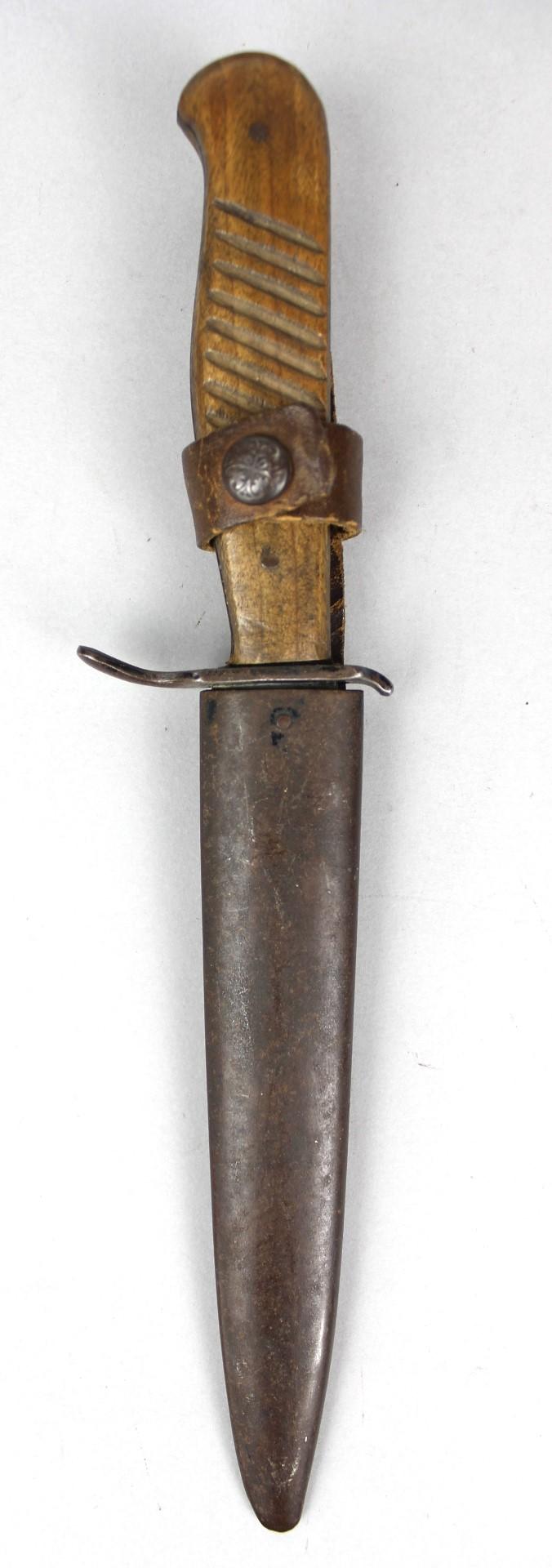 This close combat trench knife has undamaged nine grooved fruit wood handle with guarded hilt & patterned snap fastener typical of the period. Blade good .