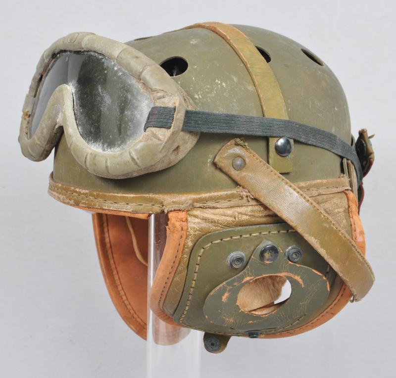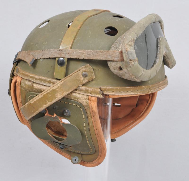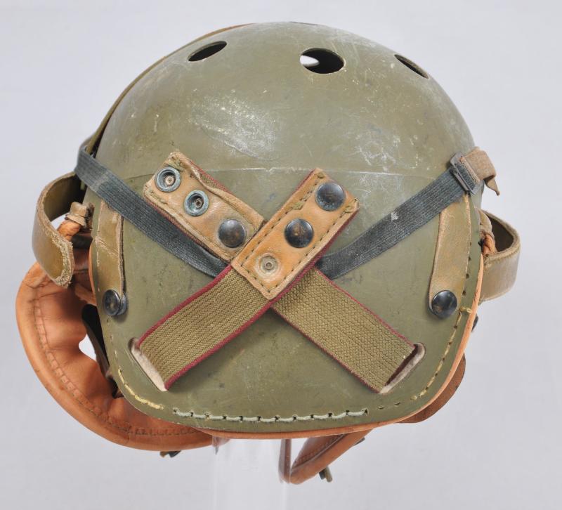 Used as of 1941 the tankers helmet was intended as a 'crash' helmet & could accommodate the M1 helmet over the top of it for ballistic protection.