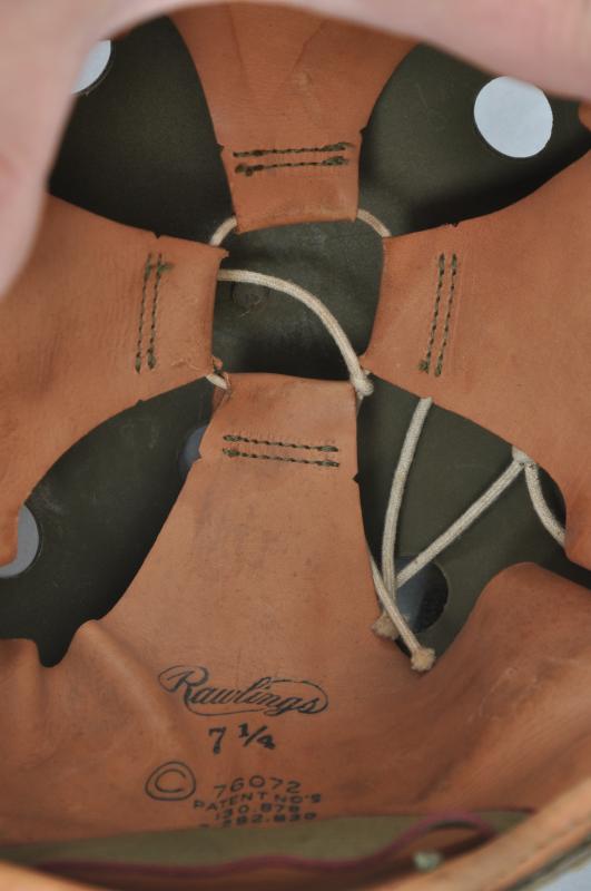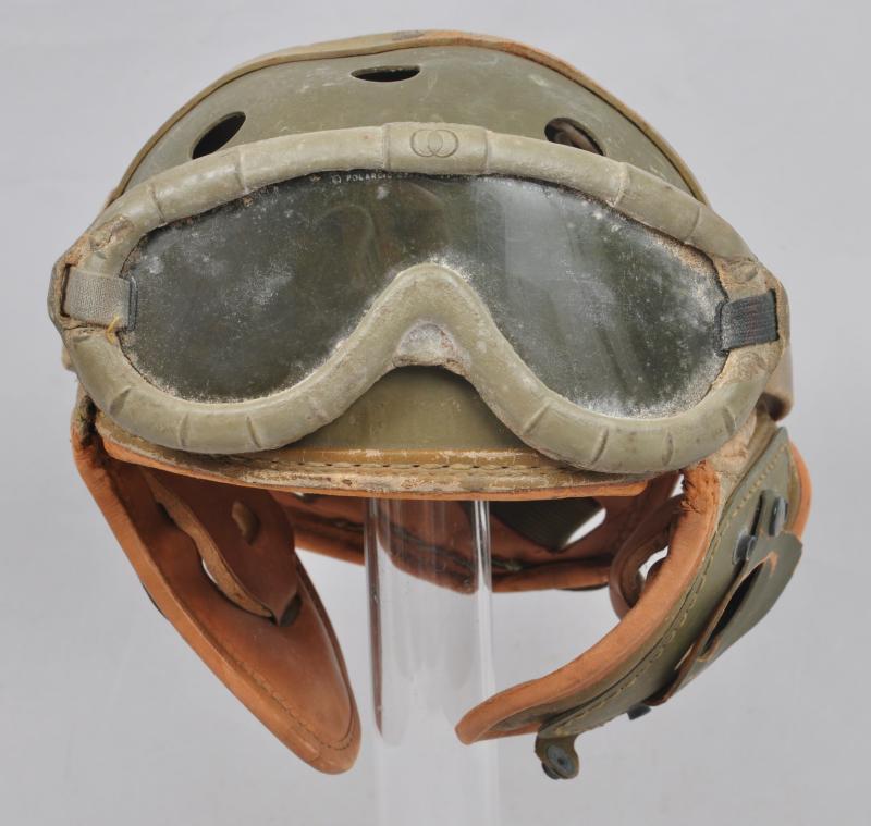Maker marked to the well known firm 'Rawlings' on inside it has all of its fittings & tightening cord to liner. Comes with original wartime US issue Polaroid goggles that have faint soldiers name to strap. Some minor wear & tear with leather flap to right side slightly displaced to top.