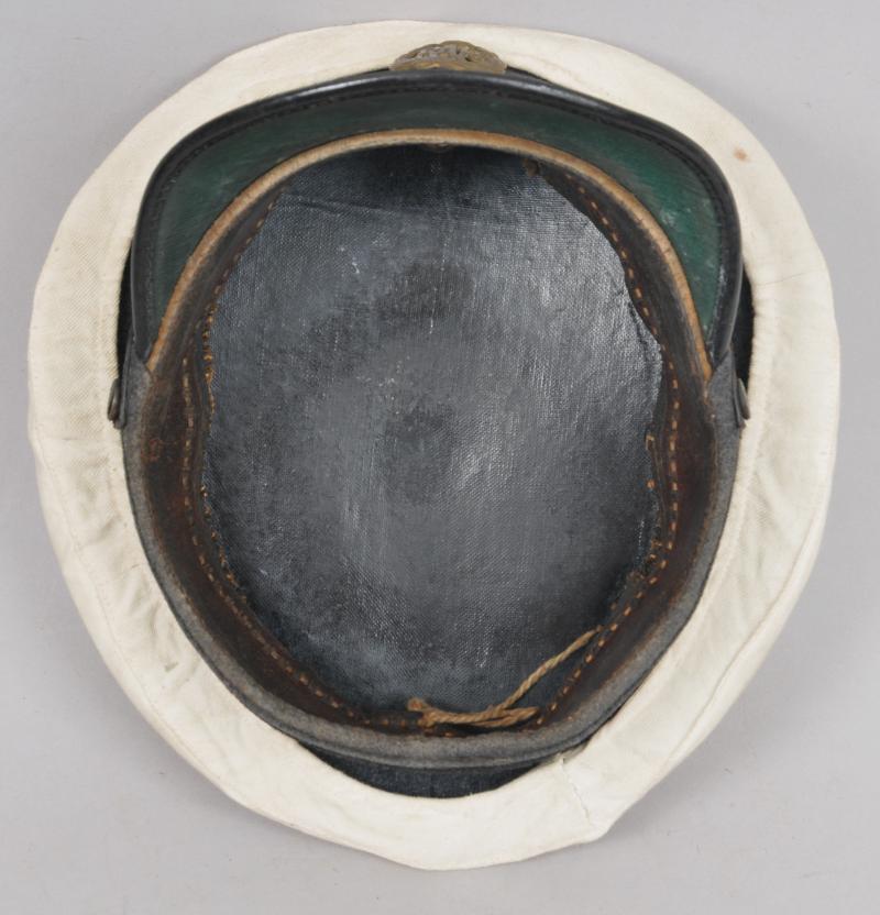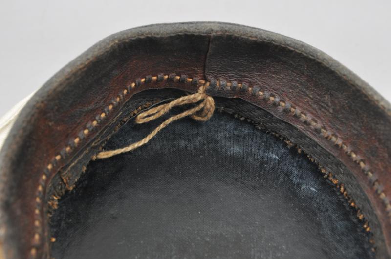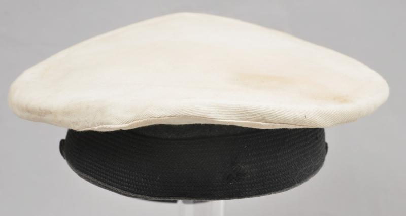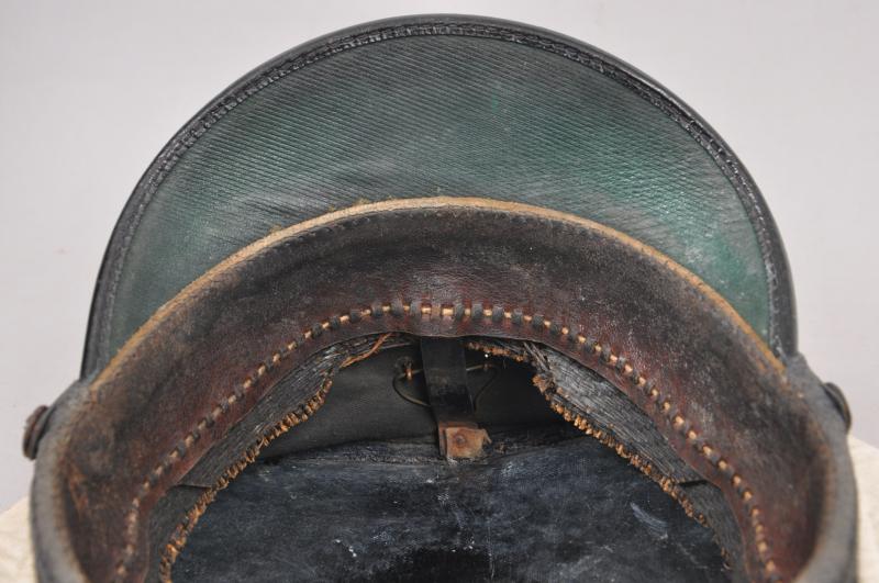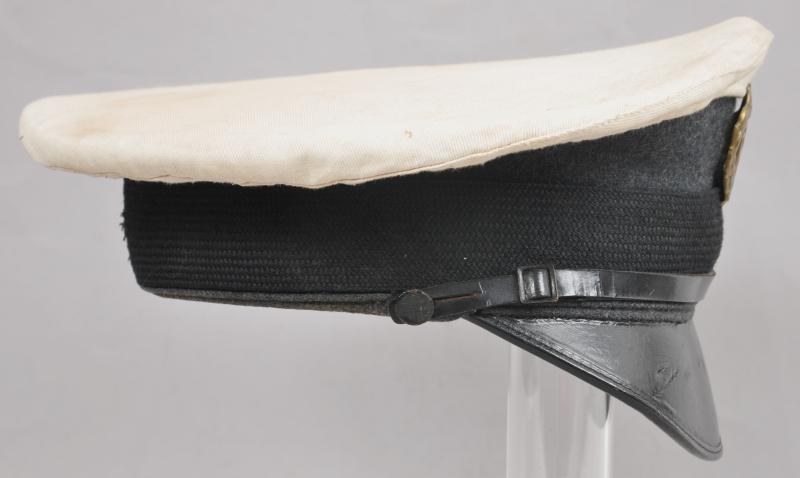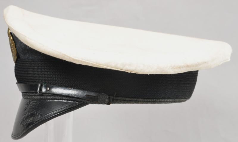 In quite excellent condition the white cotton cover is totally original to rhe cap & shows some wear overall. Complete with original chinstrap the Policeman has dropped his peak down to give the cap a more formidable appearance . Interior shows wear with a very faint WD broad stamp to underside of sweatband .