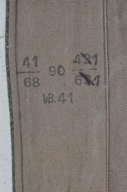 This is the classic M40 feldbluse with five button front & four scalloped & pleated pockets . Totally correct for this period are the machine stitched universal collar tabs & grey on green bevo breast eagle sewn above the right breast pocket. To the left arm is a rank chevron for Gefreiter ( Corporal ) with four belt hooks in total front & back to hold the mans combat equipment. Interior lining shows dice stamped size markings with depot date stamp 'B.41' for Berlin 1941. Traces of a uniform manufacturer can be seen to the field dressing pocket on bottom right hand corner. Very nice to still see are the four pressed card buttons to inner collar area for collar liner , these are often missing. Double button fastening to each cuff with all original buttons present.