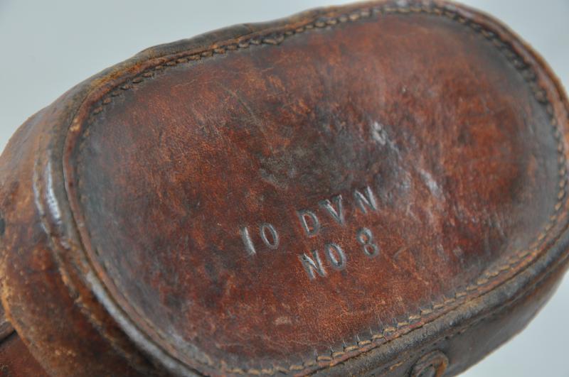 These are , typically, French made in Paris & purchased by the British for issue to a rapidly expanding army of 1914. Unit marked to top of case '10 DVN' with 'No.3' & broad arrow to front. Glasses are marked 'L.Petit' Fabricant with Patent name ' HEZZANITH'. Broad arrow to optics stem. Buckle minus from front of case.