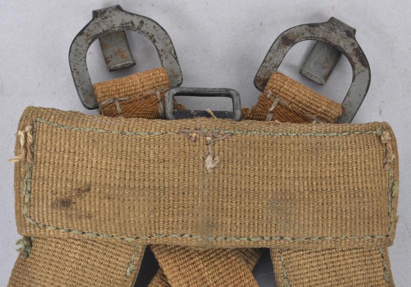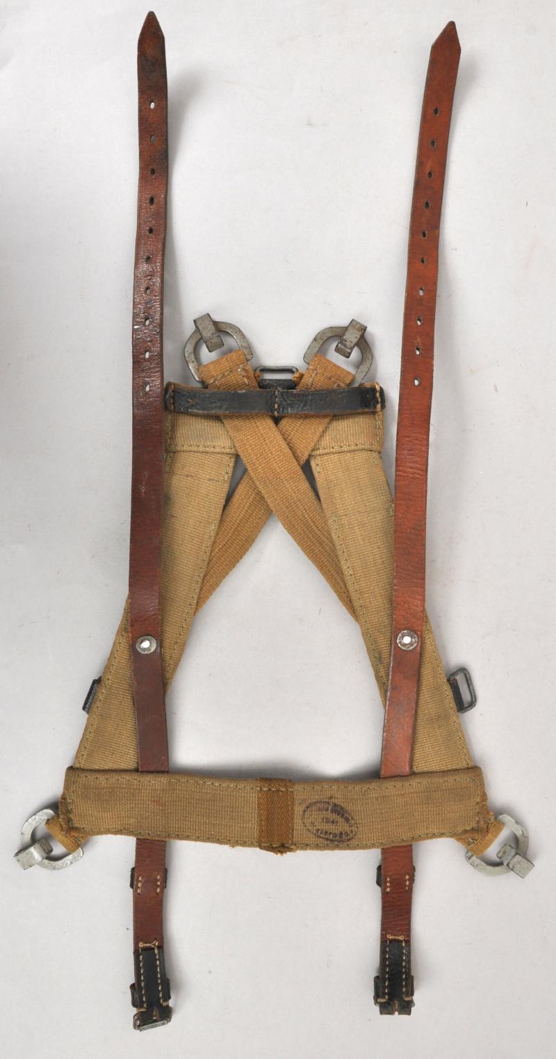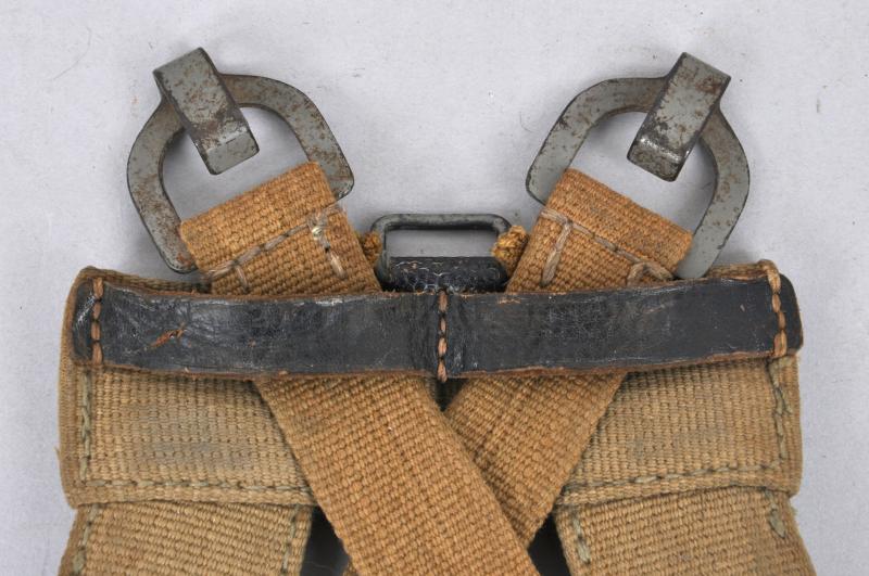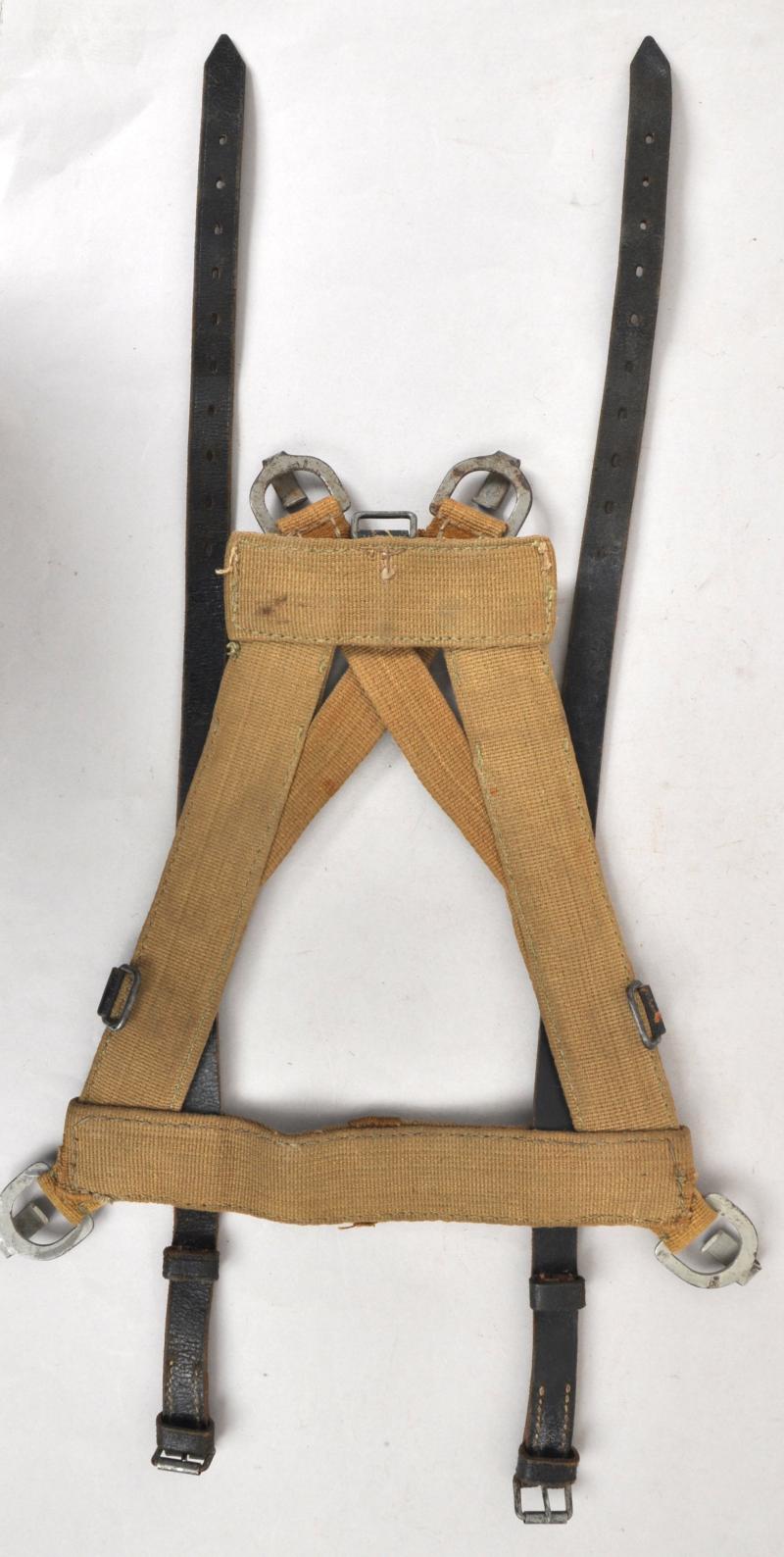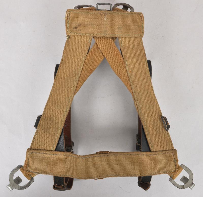 The early war German 'A frame' made of stiffened webbing & leather & very much seen in use by German combat troops of WW2. This was designed as a battle pack for attaching the zeltbahn , messkit & battle pack bag but due to impracticality was later replaced by the various forms of rucksack then in use.