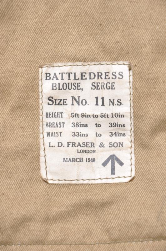 As has been recorded the first issues of the new '37 pattern battledress blouse came without a lined collar although this was soon modified with a lined collar to prolong its service life. Surviving examples of the unlined version are therefore very rare most not having survived very long at all. In excellent condition the clothing label to inside gives a very acceptable 'Size 11' with maker name ' L.D.FRASER & SON , LONDON' . There is a very pleasing crystal clear date of 'MARCH 1940' with broad arrow to bottom of label & an ink stamped WD 'Q' inspection code to lining for the year 1940. All of its original brass dished buttons are still present to lining & cuffs with early revolving shank vegetable ivory buttons to shoulder. Upon only very close examination can I see the odd tiny pin prick moth hole but these are in no way detracting from what is a very rare item.