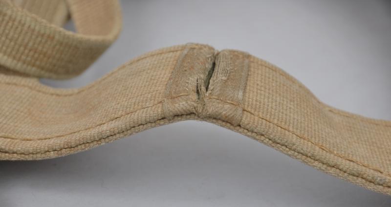 This piece is a pure webbing issue having webbing , rather than leather , steel tipped 'Lux' straps to hold the zeltbahn . All carbine hooks to each corner are intact with rectangular side loops to secure the greatcoat/blanket as required.