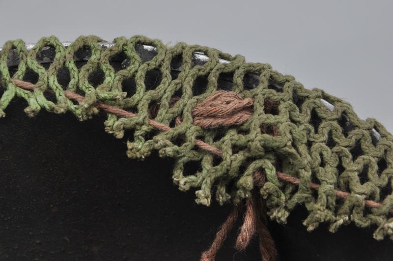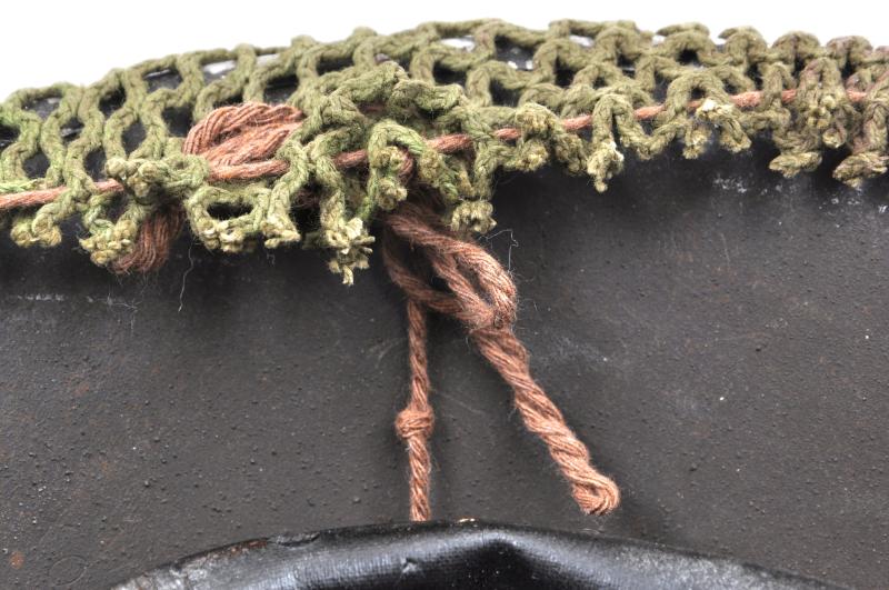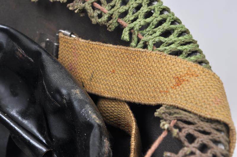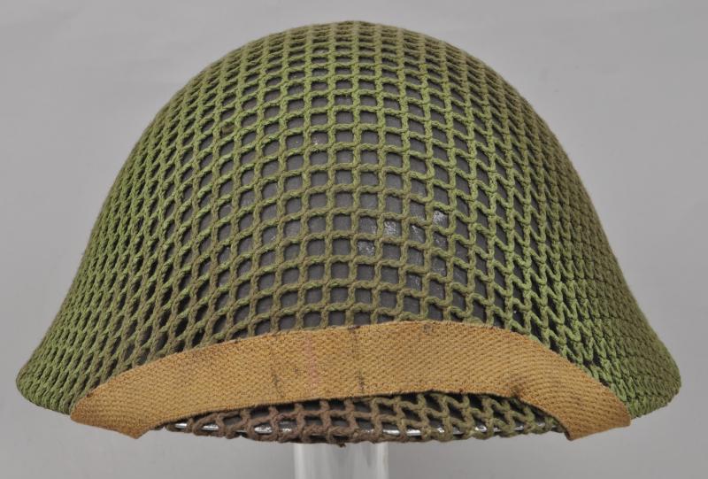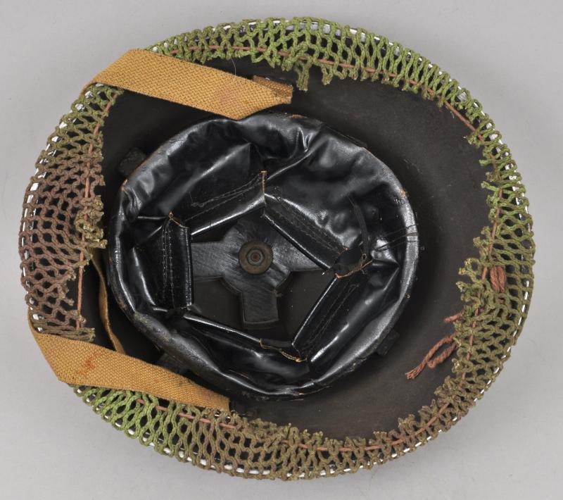 Finished in rough textured khaki paint the liner is clearly dated '1943' . Chinstrap intact. Fitted with two tone ( Green & brown ) Canadian camouflage net & overall textbook example.