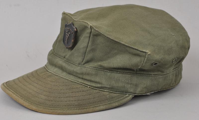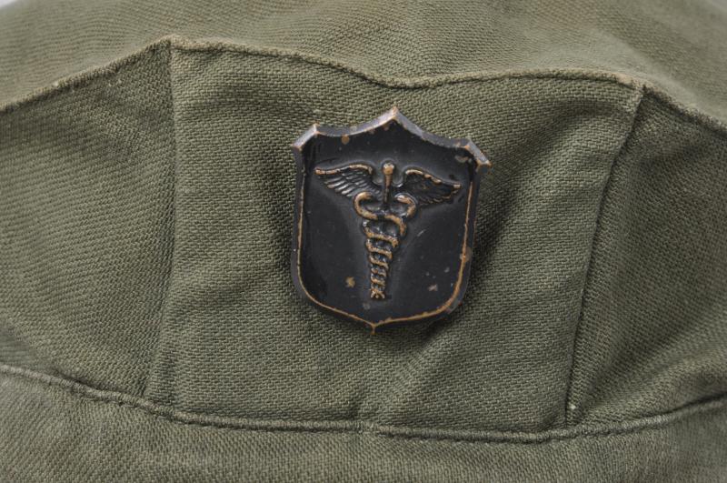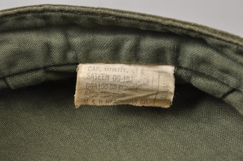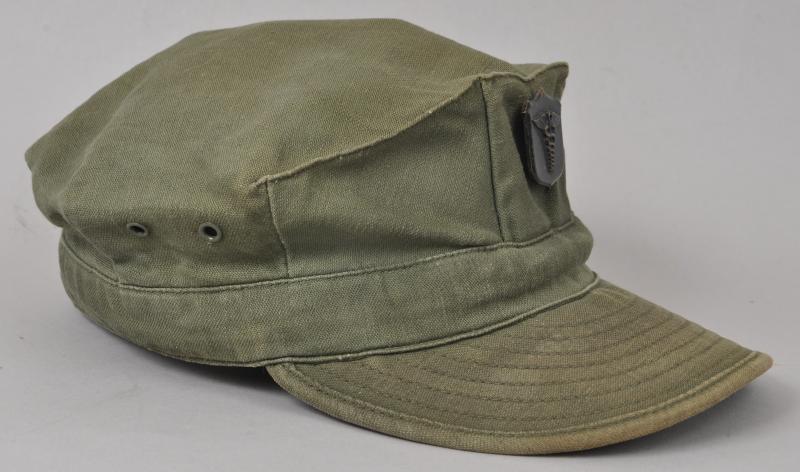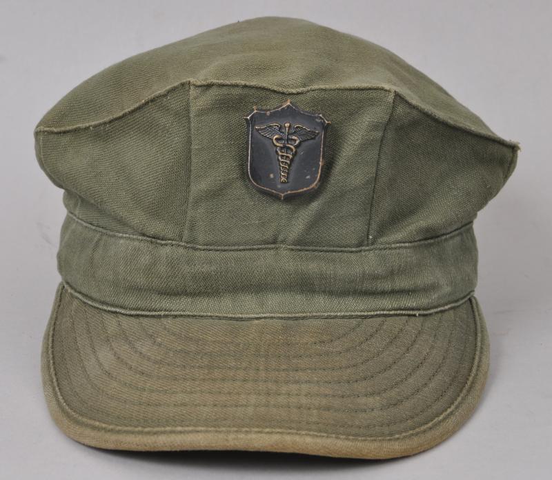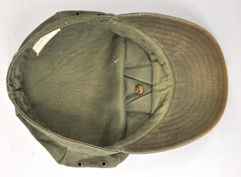 Vietnam War period USMC Utility cap with 'Corpsman' medical personnel badge to front. Eight point construction with label intact marked 'DSA' & '69 dated.