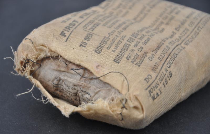 A May 1918 dated example of a WW1 British First Field Dressing opened at one end so as one can see the similarly marked contents inside.