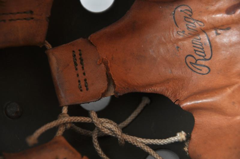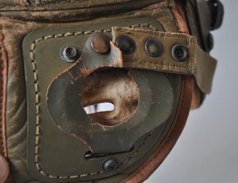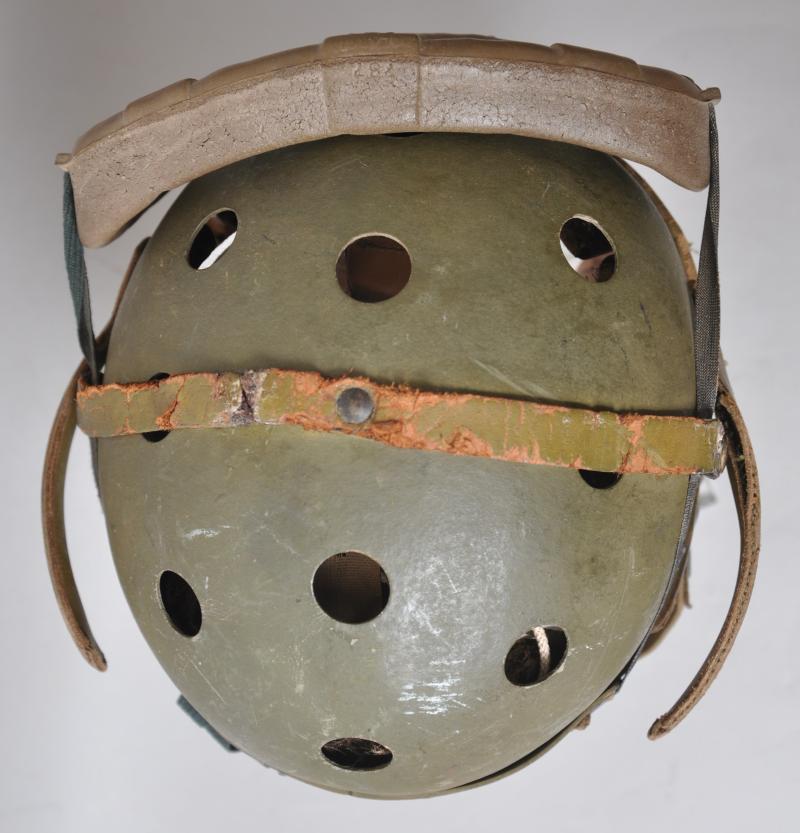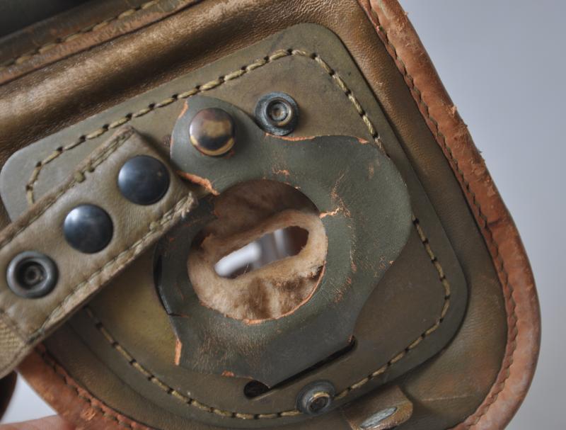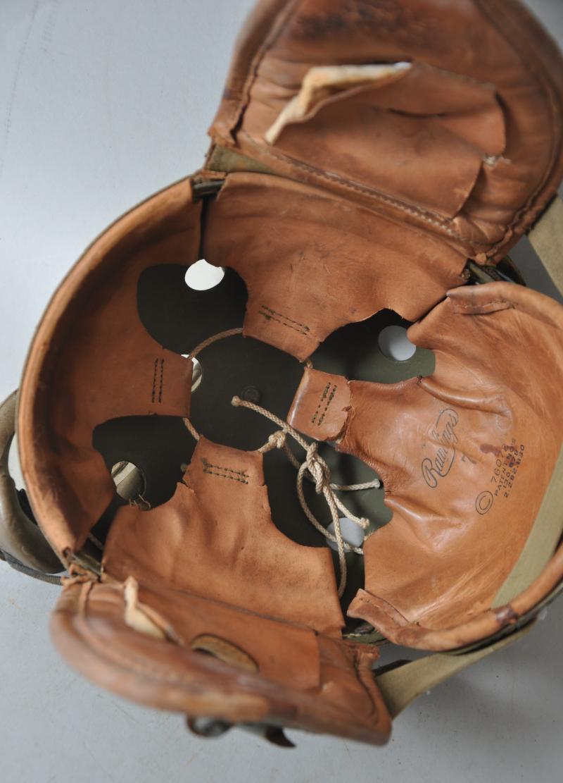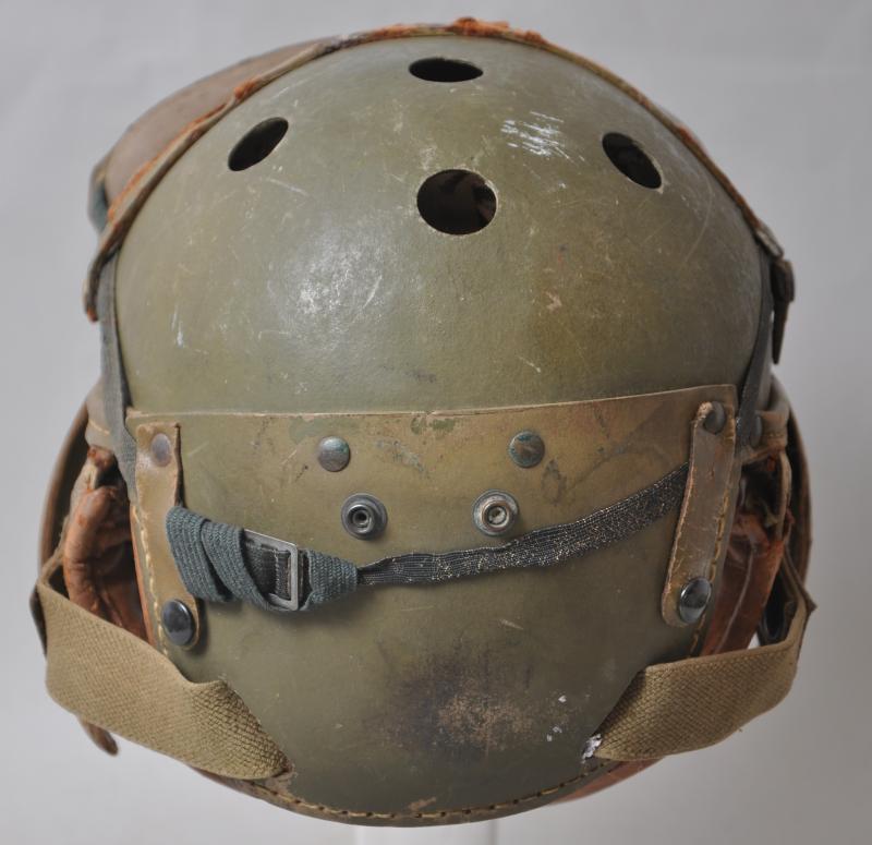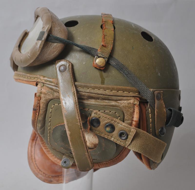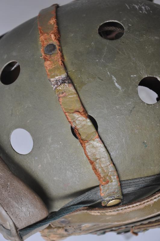 A totally wartime issue this helmet has both its snap fastened rear straps with adjustable arms to each side still present. There are some collector repairs to where the integral leather ridge on the shell has become worn with the goggles held in place to make a very visuallly effective tankers display piece. Internally the liner & tongues are largely intact , one collector repair to rear of one tongue to strengthen a torn area.