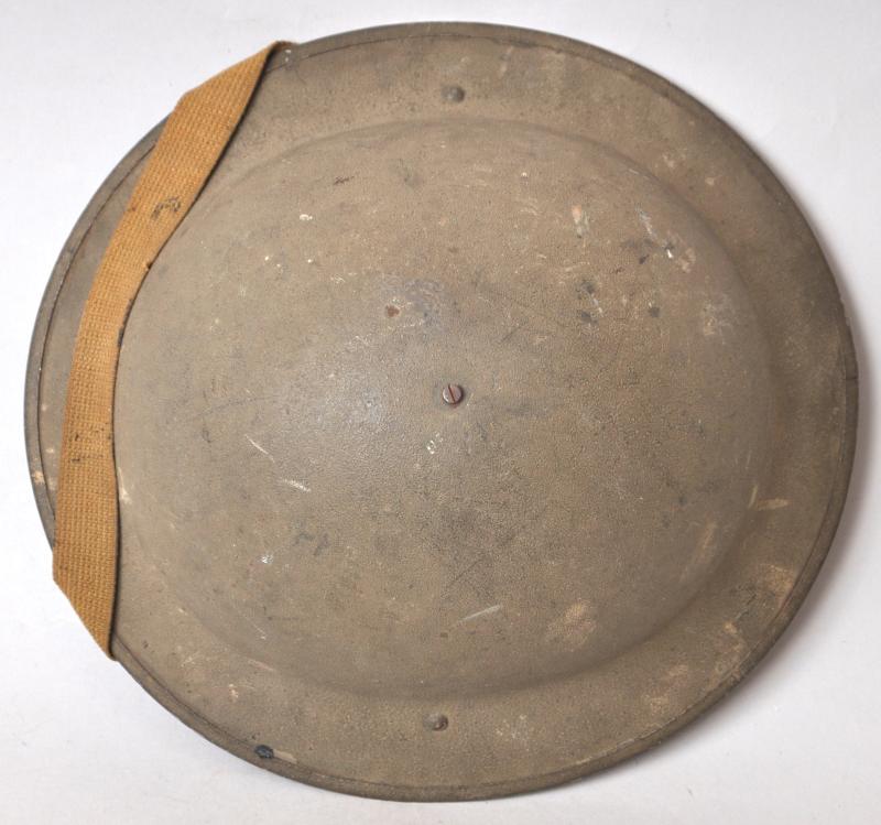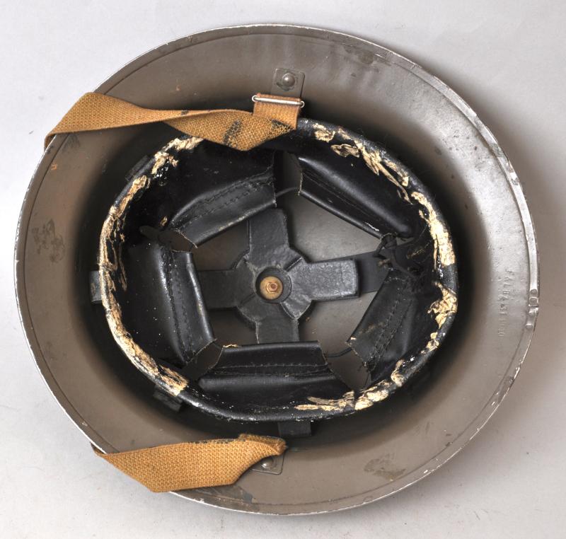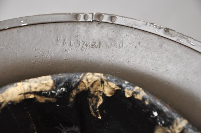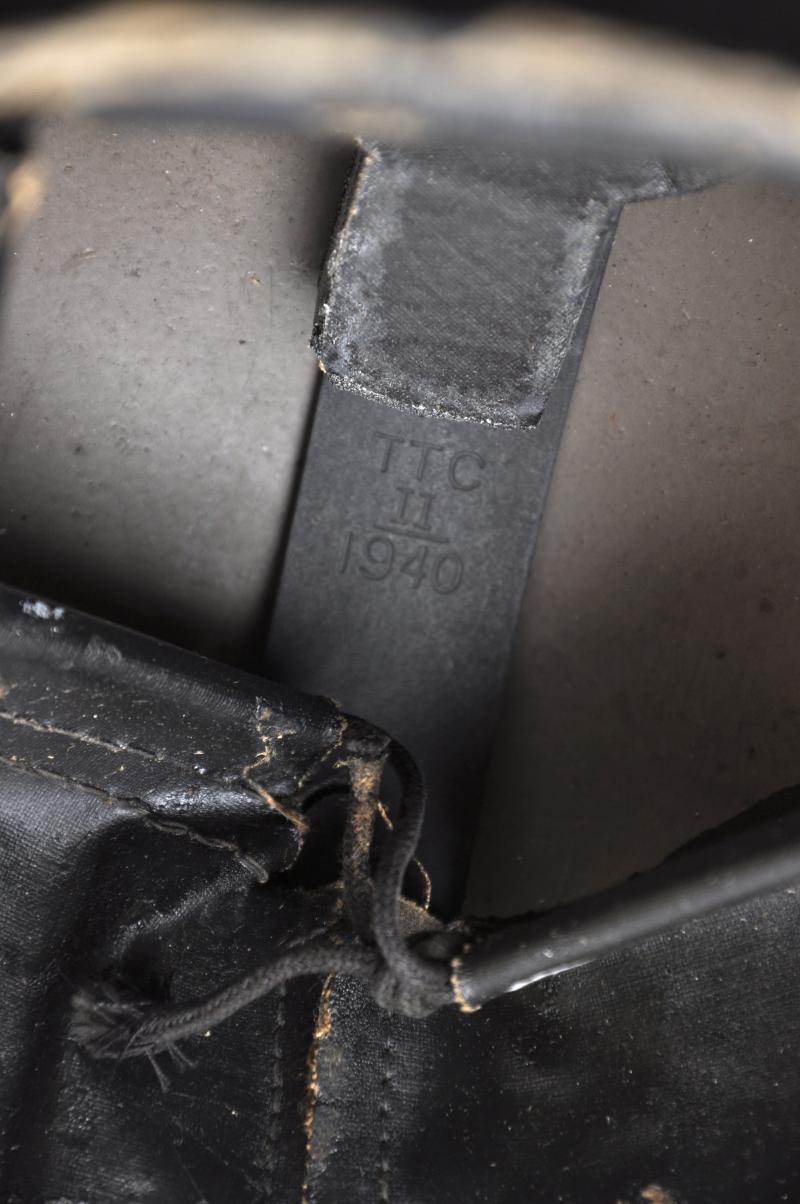 Finished in a rough textured granulated khaki paint finish the smooth underside of the shell is marked 'F&L 1940' for the firm Fisher & Ludlow. Liner cradle marked 'TTC 1940' this for the firm Teddy Toy Company another well known Dagenham based British helmet liner manufacturer in WW2 from 1939-1941. Chinstrap is of the second pattern seen after 1940 of one piece elasticated webbing. Overall in excellent condition with some newspaper remnants stuck to the rexene of the liner from having been loft stored for some time.
