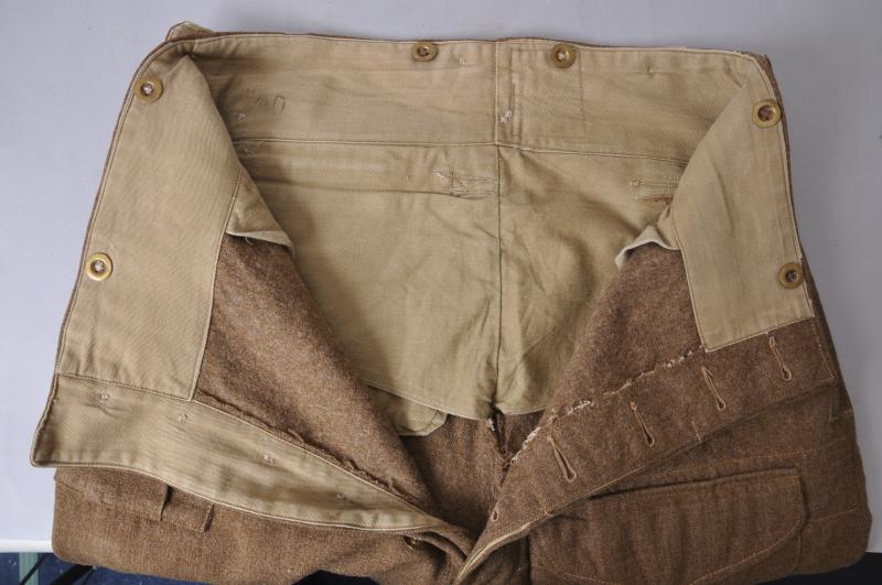 Very rare pair of the 1937 pattern battledress trousers with brass dished buttons , belt loops & concealed pocket flaps. This pair still have their ankle buttoning tabs which were ordered removed as of 1941.