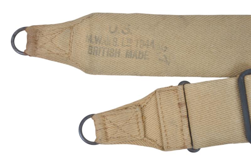 Made by the British for the US military under the lend lease agreement this is a 'BRITISH MADE' marked musette or GP bag strap from the British webbing equipment company 'MW&S' with date 1944.