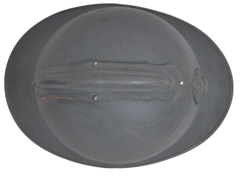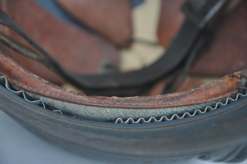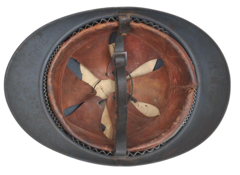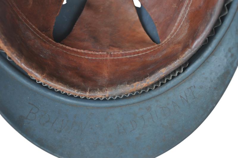 Factory paint is in the blue dark matt finish with a high proportion remaining. The liner is the harder to find all brown multi piece 2nd type format ,all alloy spacers remain in place . The helmet looks to have been as with so very many reissued and thus bears two sets of names . To the front inner peak is marked 'Adjutant Boivin'. Chinstrap complete.