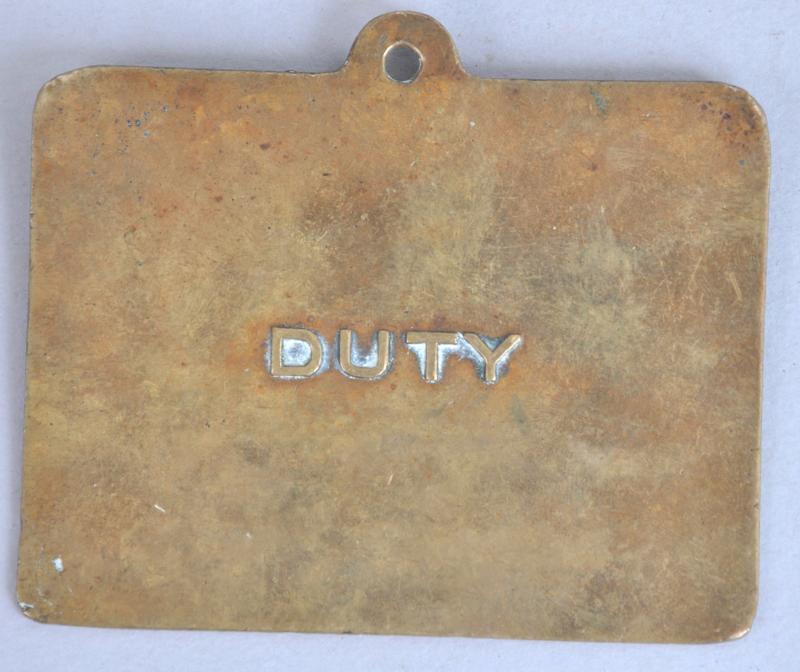 A rare high quality version purchased with unit funds , being die struck and having a nice high relief to the badge design and lettering . To the reverse is the word "DUTY" thus the plate would be hung this face out when the soldier was on camp duties such as guard etc . Condition is good with light polishing wear and a nice deep patina