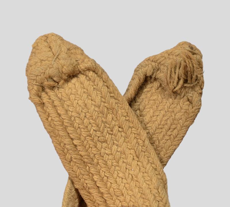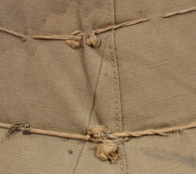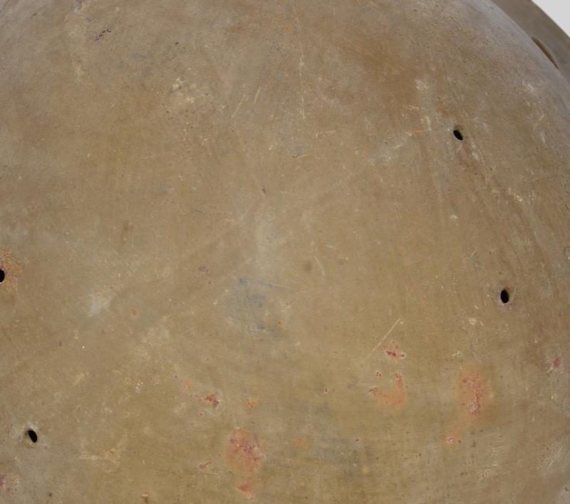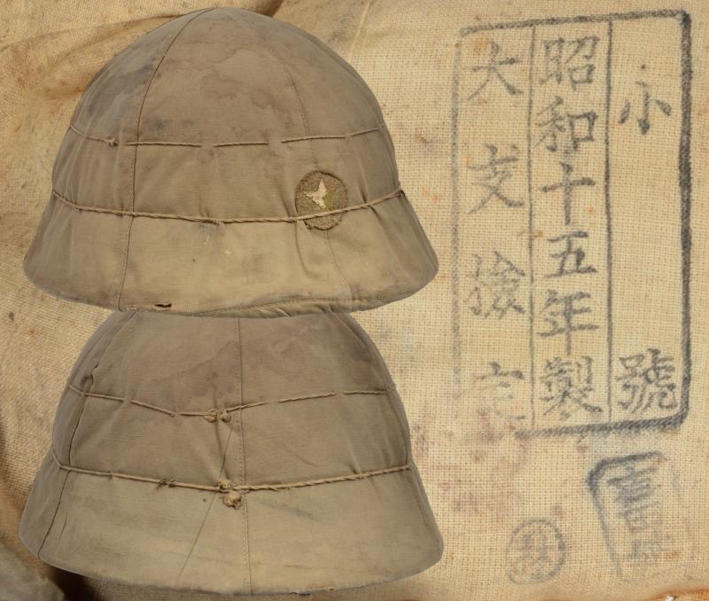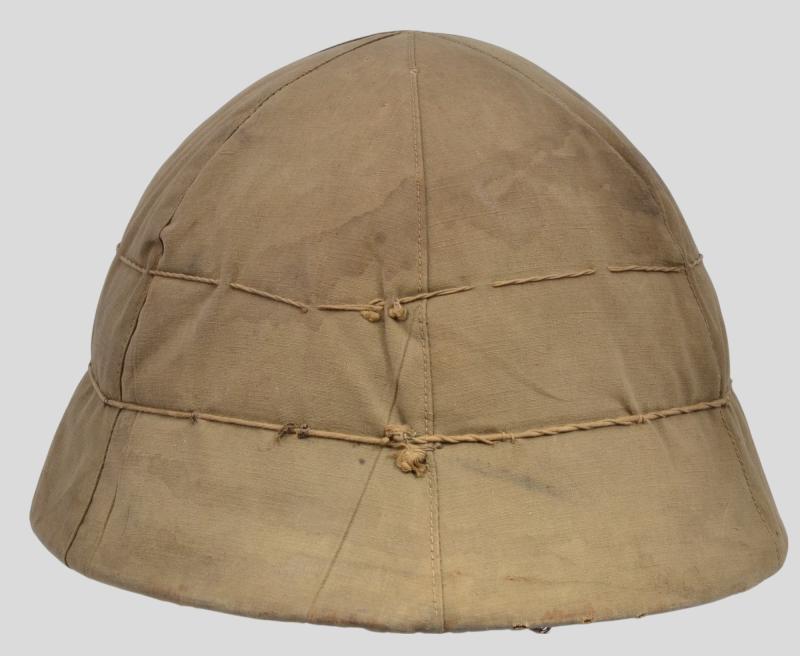 As far as covered Japanese Army helmets go this one would be very very hard to improve upon . A typical text book Army Type 90 helmet in the rarer smaller size fitted with its original and field modified first pattern cover . The cover is a very scare early version having to the front the Star insignia upon a wool disk factory applied prior to the covers inner white face being applied . What remains of the star is about 75% of the fine rice paper backing . The tight gabardine like fabric has seen hard service use and is grubby and been there with much character .The most outstanding feature is the thin double row of twin carefully sewn to the covers outer face to facilitate application of foliage . The covers inner face is in the off white gauze like lose calico material and bear the three ink stampings including Manfactures info and small inspectors stamp as well as the typically un filled in personal info box . The original tie cord is present with its hand applied bar tack detail at the rear . The important inner seam overlock detail is correct . The helmet has a high percentge of its early /mid war Imperial brown paint that is dry and marked where the cover has sat in place forever . To the shells rear is the correct off white hand applied kanji character for size small . The liner is the classic pig skin army type with three rear bar tack stitches punced size kanji indicator and a good clear 16 stamp under the front pad for 1941. All the chinstraps remain in a super and salty condition with their correct hand mitred tips . This makes a true centre piece ,top shelf + helmet