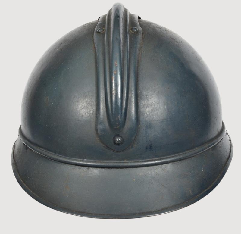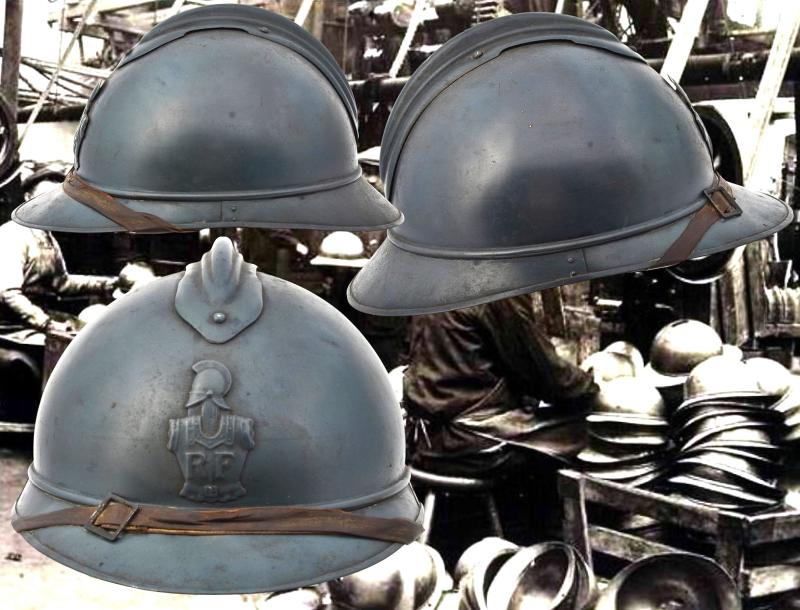 An early version of the textbook factory helmet as worn here by a soldier of the Engineers . There is a very high percentage of the semi gloss light toned horizon blue paint . The one piece black leather liner is good and supple and the chinstrap complete .
