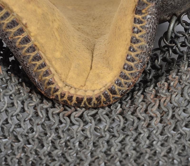 A very crisp example of the iconic WW1 British Tank Crew "Splatter " mask . The chamois leather to the reverse shows only light use and the kapok like cushioning is still full and plump . Both factory tape tie cords are present . One can still see a thin twine length tied in place running through a small metal eyelet , this is the remains of what was the fitting instruction card that came upon masks when issued . All stitching is good and tight and importantly in the same twin needle hand applied stitch to the masks lower areas seam . The fine pig skin leather outer face is very good with a few minor age related scratches etc . A very much above average example.
