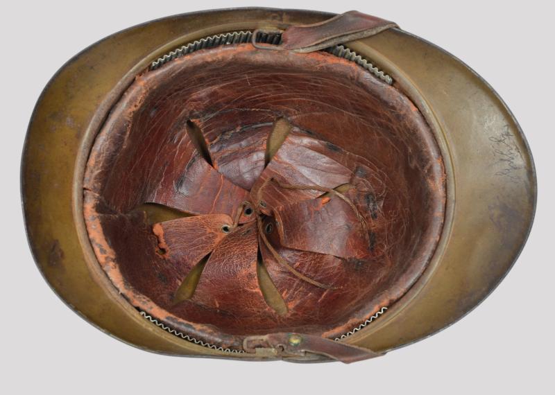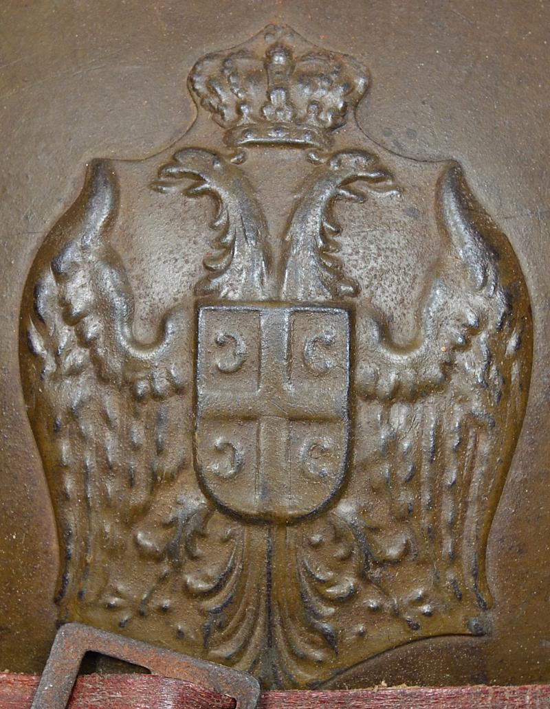 The French Government supplied their famous Adrian helmets to many foreign governments and organisations ,one of the very rarest contacts of helmets were those supplied to the Army of Serbia . This is in all respects a textbook factory helmet fitted with the Serbian specific frontal plate insignia . The plate/badge has the correct low profile fit and level of detail ,being made in a quite thin and and tight fitting stamping . All paint finish is factory applied and an exact match between badge and shell .There is an excellent and mellow patina with a few areas of rubbing ,chipping and light well oxidized dark russet rust .The liner system is the rarer one piece type in a brown sheepskin hide .There are two alloy spacers to each temple area with a good tight fitting dark blue wool headband and no broken fitting blades . The chinstrap is good and supple with verdigris to the brass rivet . An exceptionally rare item of WW1 headgear .
