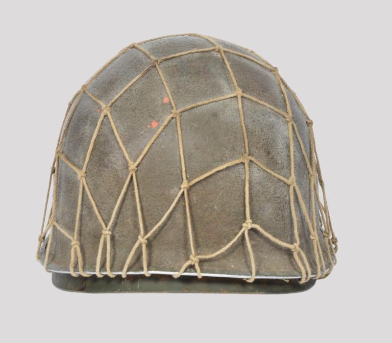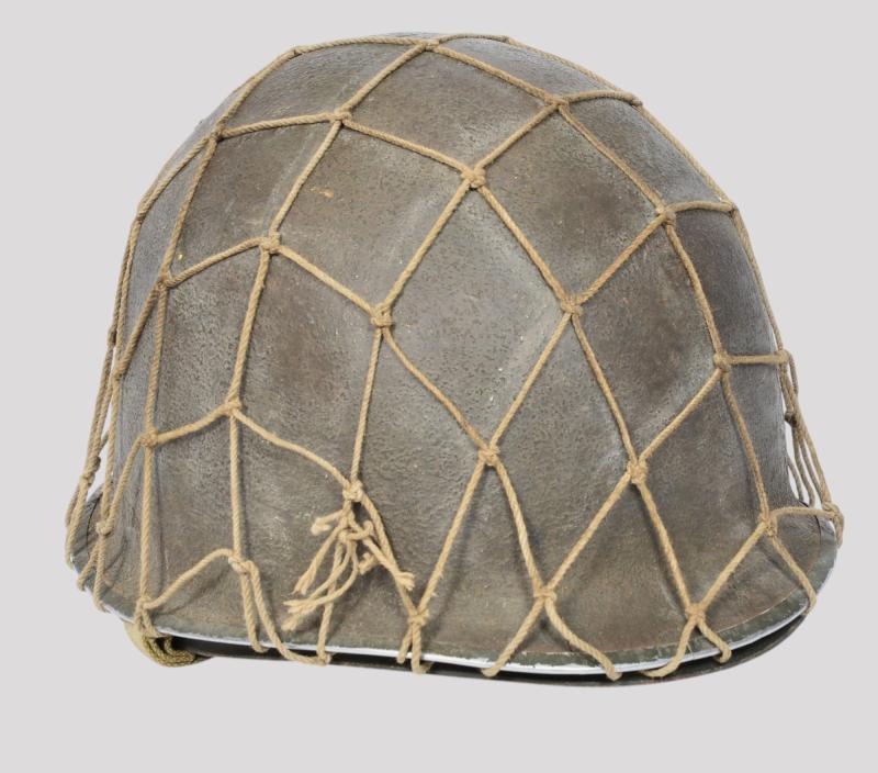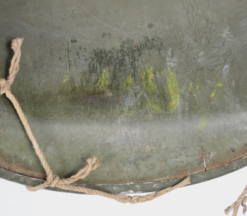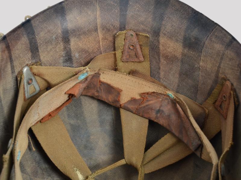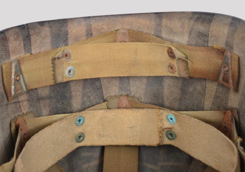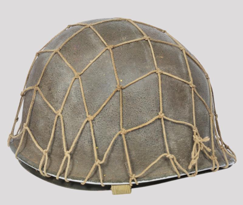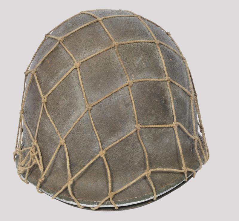 The liner is a classic high pressure Inland version from the early transition phase 1942 having the cotton tape suspension as of September but having the snaps for the earlier Rayon sweat band which is said to have only lasted one month with the snaps deleted from the process by October. To the liners exterior is a very good original factory paint . The liner has a build up of dust from attic or barn with much strap toning & some loss of the bands forehead leather padding and suspension detachment . There is a very high degree of paint with just some rust staining . The shell is a classic early Schlueter . The chinstrap has the very first type of buckle with its characteristic hollow back and raised bar . The factory textured finish is still excellent with a nice gentle patina .The set is completed with a Dennison type large weave net .