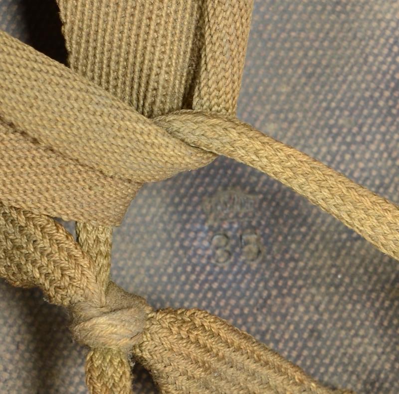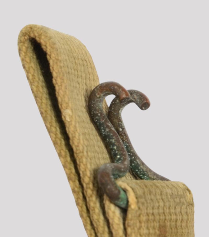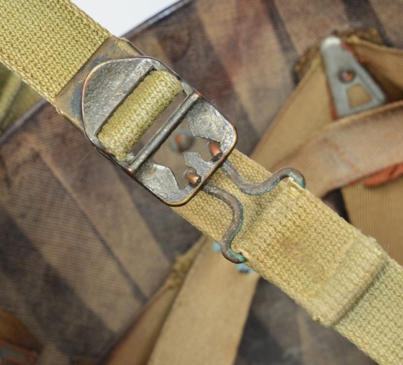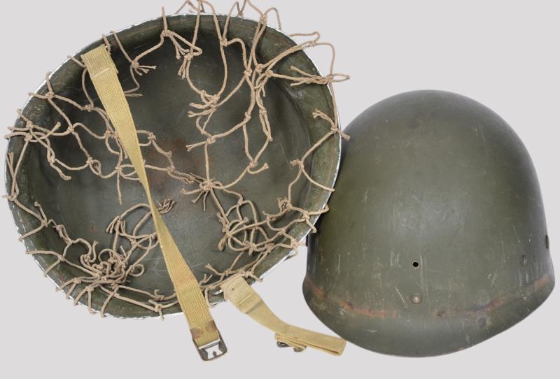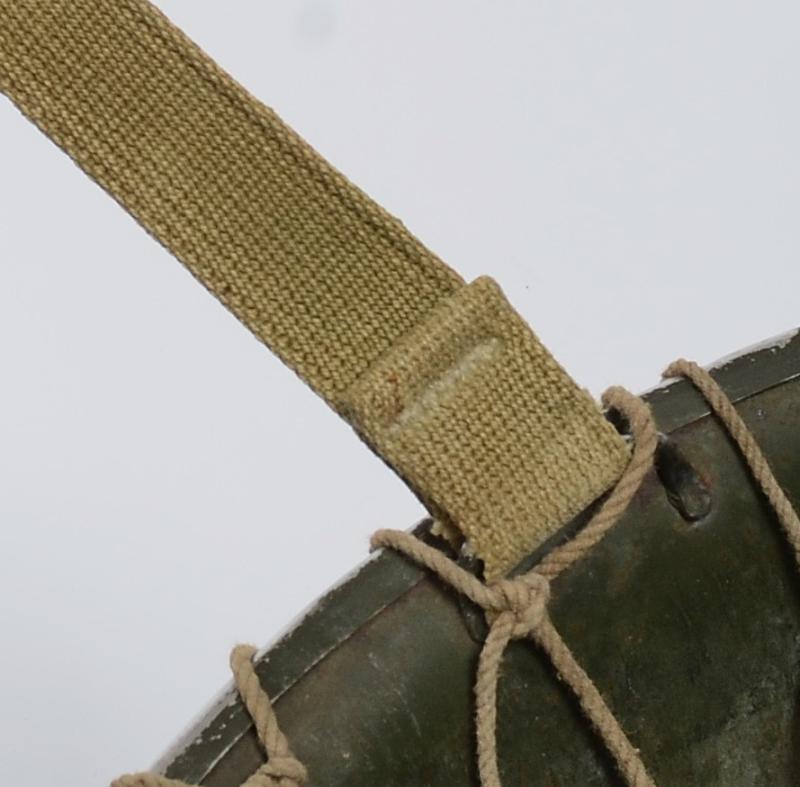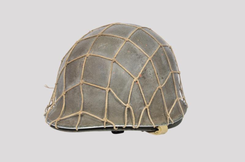 The liner is a classic high pressure Inland version from the early transition phase 1942 having the cotton tape suspension as of September but having the snaps for the earlier Rayon sweat band which is said to have only lasted one month with the snaps deleted from the process by October. To the liners exterior is a very good original factory paint . The liner has a build up of dust from attic or barn with much strap toning & some loss of the bands forehead leather padding and suspension detachment . There is a very high degree of paint with just some rust staining . The shell is a classic early Schlueter . The chinstrap has the very first type of buckle with its characteristic hollow back and raised bar . The factory textured finish is still excellent with a nice gentle patina .The set is completed with a Dennison type large weave net .