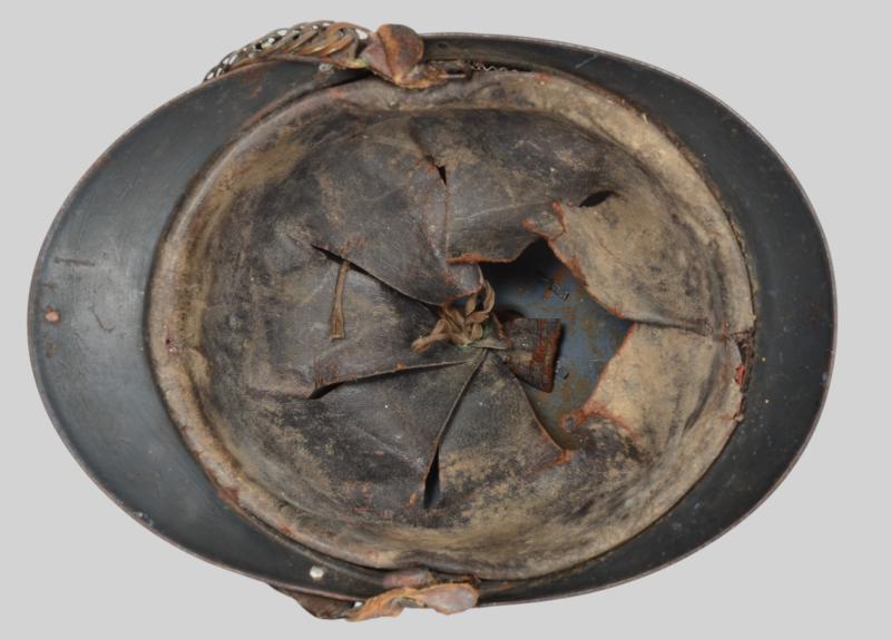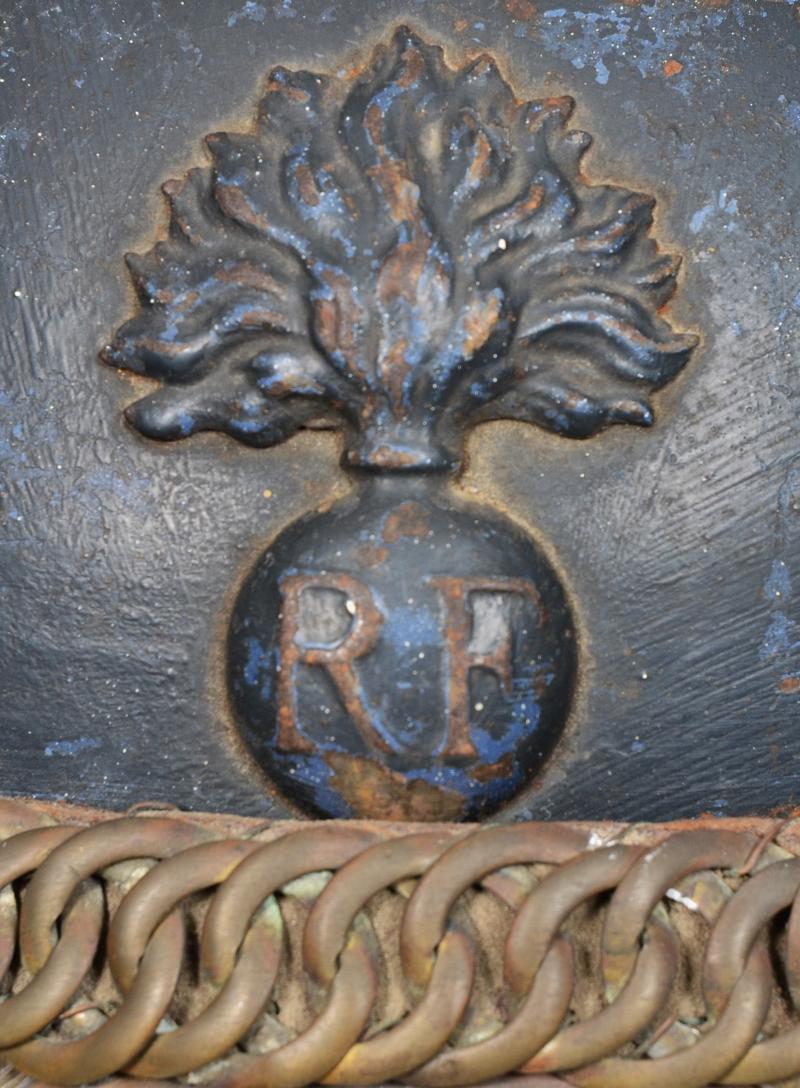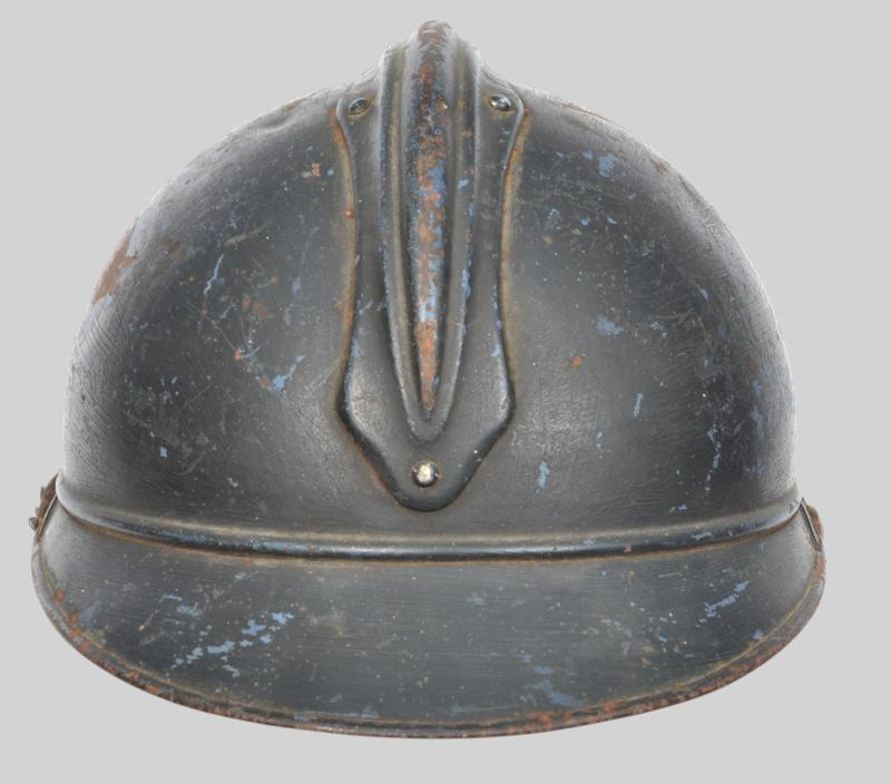 Helmet is a standard M15 Adrian helmet of early issue with grenade badge as worn by both Infantry and also cavalry troops. Helmet is unique having had the chain chinstrap of brass links period fitted . This chinstrap was from a shako only worn by a few mounted French units being Chasseurs de Cheval , Chasseurs de Africa and , as here, most likely Hussars . Hussar connection is evidenced by the presence of a scratched in 5 pointed star to rear skirt, this in turn being a rendition of their M10 helmets insignia . The helmet also has the Soldat de Grande Guerre plate fitted and has received various depot overpaints . Untouched and a rare addition to any Adrian collection.