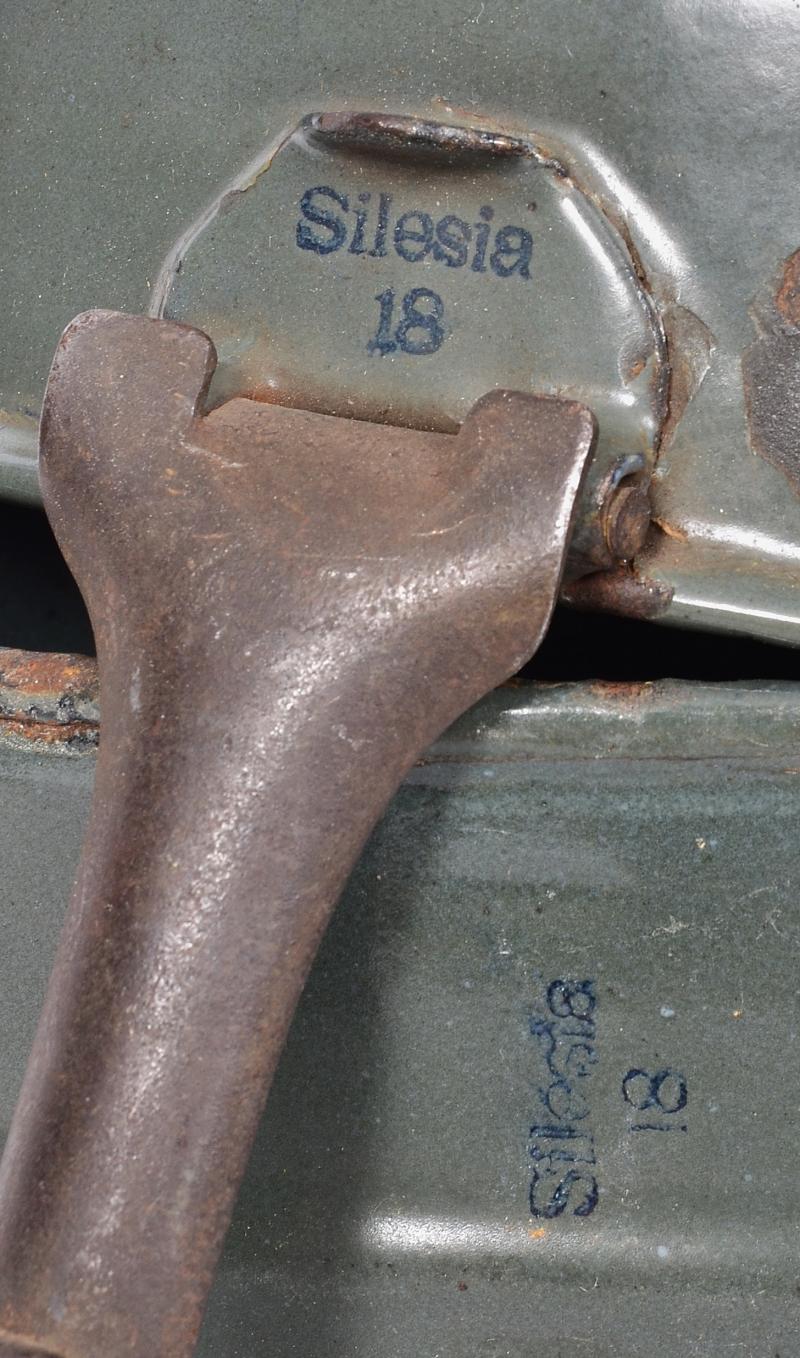 A fine matching set of same maker and date twin marked 1918 green grey enamel standard mess tins . These are in a good field used state with some normal dings and scratches etc . The original wire hanger still remains firm and in place .