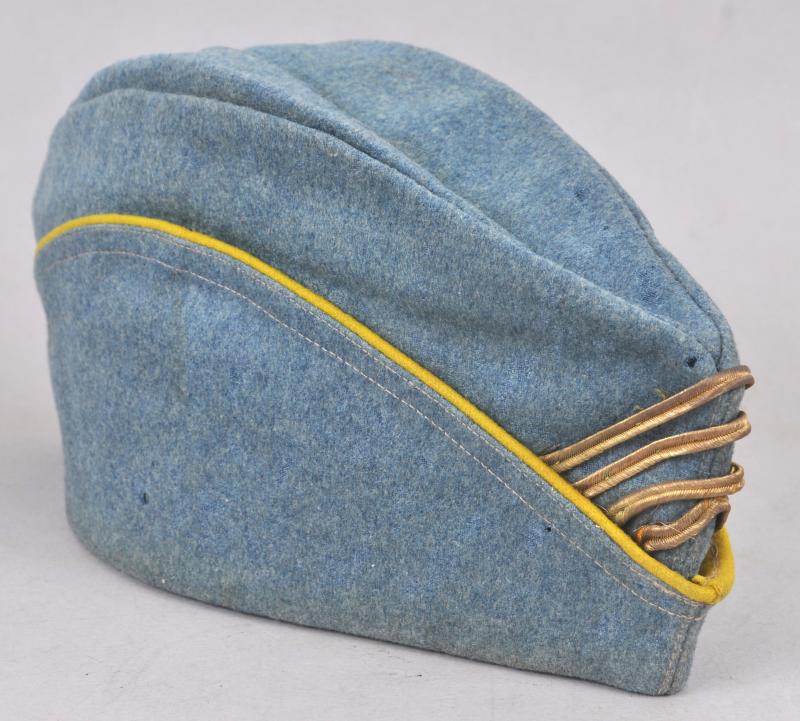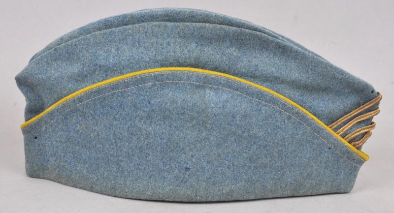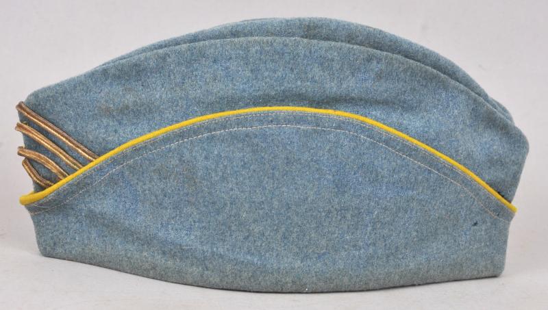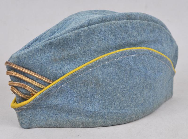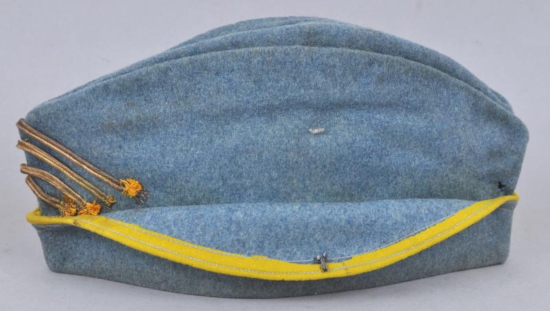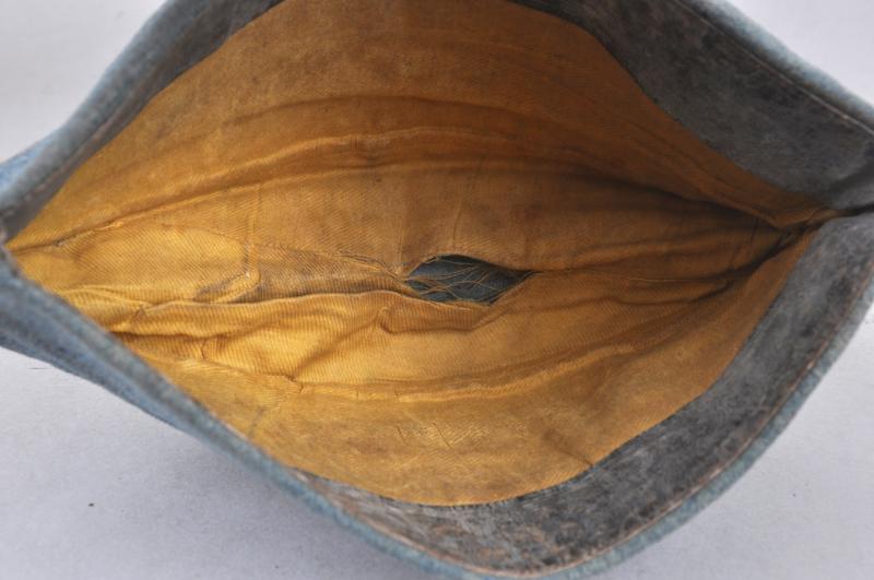 A very good example of a French officers side cap . This is cut in the M1891 style but in Horizon blue fine wool . This style was replaced from 1918 with the higher "Empire " style ( thus making this example certainly Great War ) . There is a yellow infantry piping and 4 gold bullion high ranking ,Chief du battalion gallons to the front . The condition is very good with only a tiny few small moth nips . the high quality golden yellow brush silk liner is a little grubby but good .