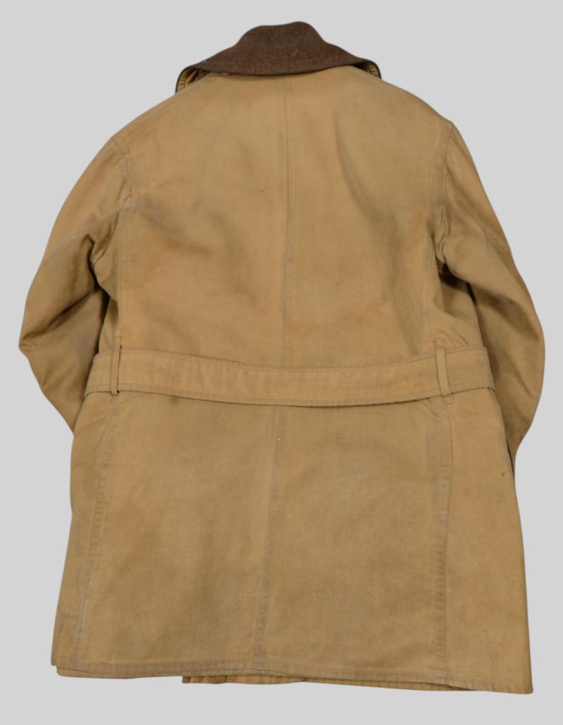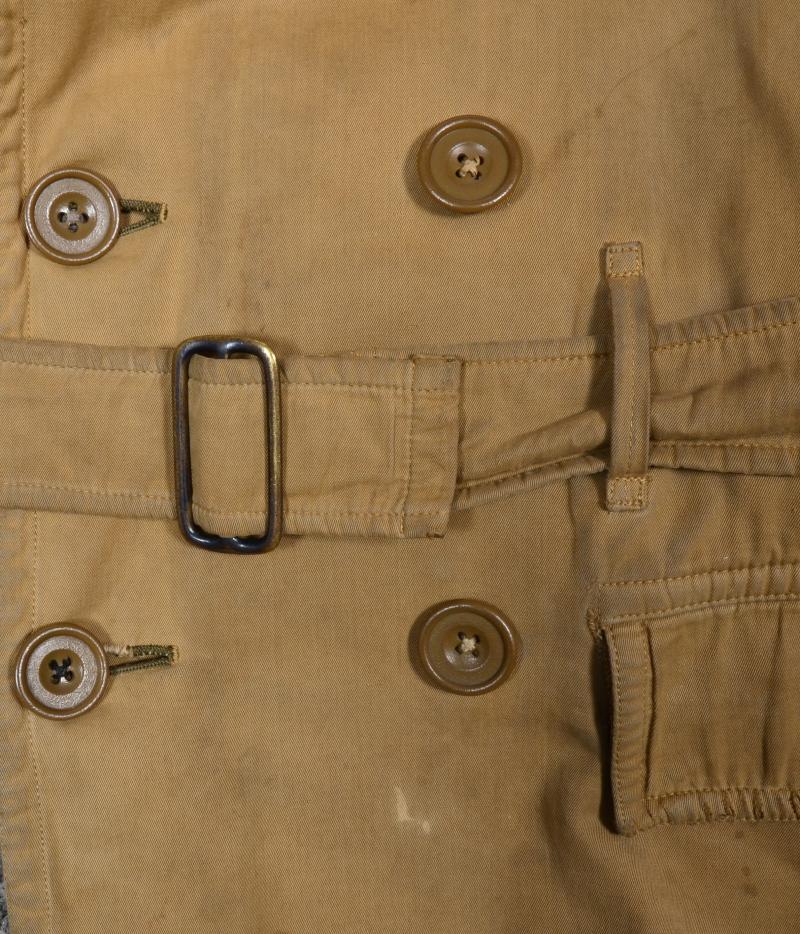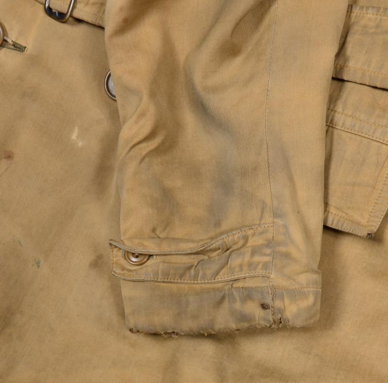 This is a rare British made example as is indicated by the Egyptian cotton twill of its manufacture rather than the lighter cotton duck of those made in the USA . The buttons also differ on British examples as can be seen here as well as the lining being of British battledress serge material . There is a good level of wear and use to make a combat display or for wear . Label removed. The chest is an approx 42in, rear collar to bottom edge 34in , and armpit to sleeve edge 21.5in.