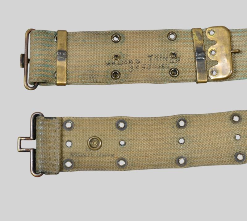 A well used combat belt with lots of been there character . There are some ink names and ID and US stencils & faint maker marks . All complete and undamaged .