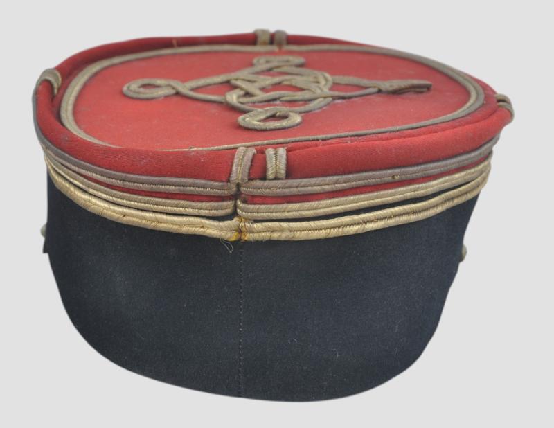 In the black & red colour originating from the 1880s these were still being worn in the field by French officers during the early frontier battles against the invading Imperial German Army. Kepi has Hungarian knot to top of crown signifying officer rank with three gold rank braids for rank of captain. The gold regimental numerals were dropped after WW1 & not worn at all by officers at Brigade Level. Both chinstrap buttons have the flaming grenade of infantry. Interior is in black satin with high leather sweatband & wear to its entirety .