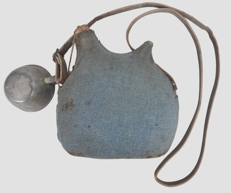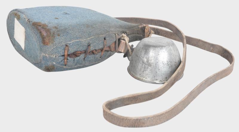 WW1 French 2L waterbottle & cup with blue cover as used from 1915 onwards.