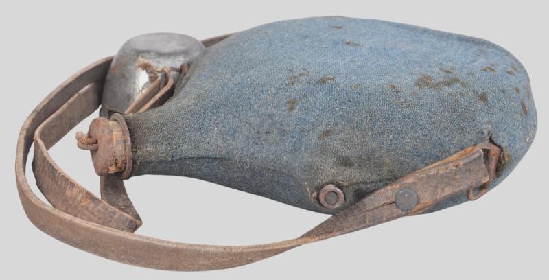 These larger 2 litre bottles were standard infantry & other combatants issue for this period the covers made from offcuts of the M15 blue uniform. Carrying strap intact with nametag to bottom.