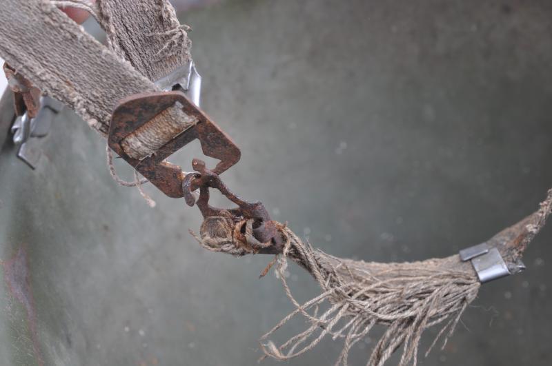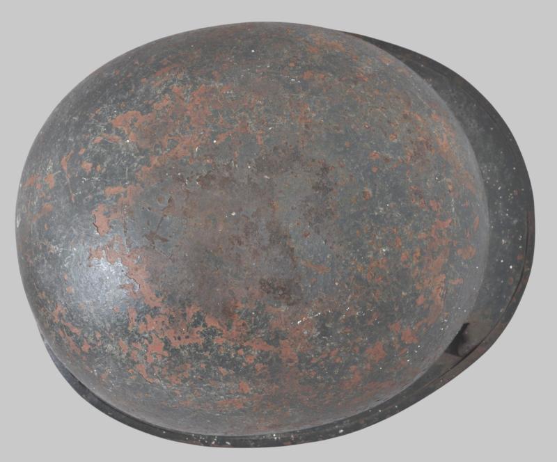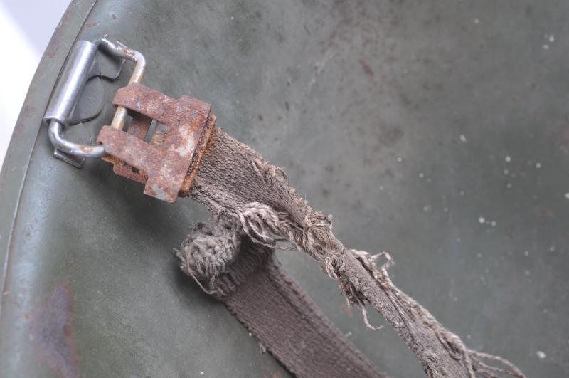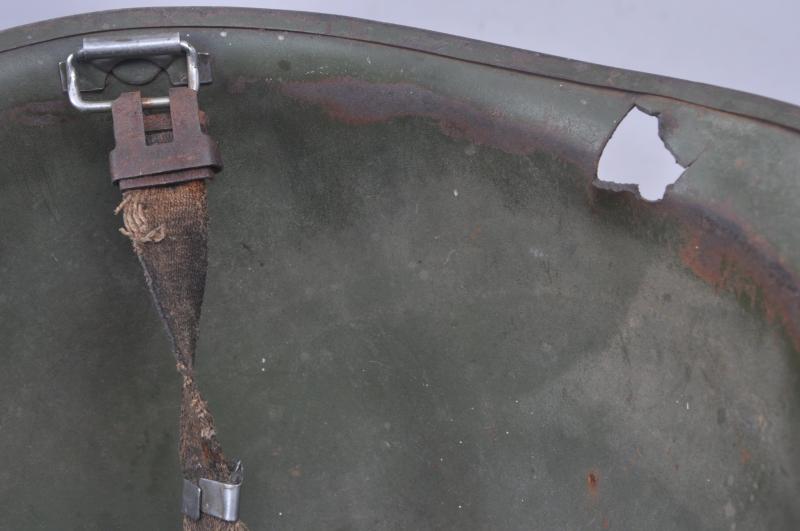 This helmet is a classic US made shell from the Korean war / Vietnam war era deemed surplus by the US Government & supplied to Argentina much before the conflict. These were typically reconditioned by Argentina as is the case here with a distinctive Argentinian dark rough textured green repaint applied to its exterior & Argentinian made chinstraps & fittings to inner. Having come back from the Falklands conflict the liner was most likely left behind perhaps as a result of wounds received via the impact hole.