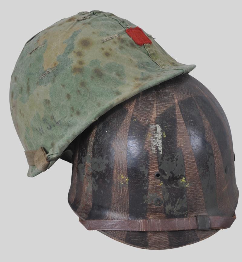 An iconic American M1 helmet of the Vietnam war as worn by a member of the USMC.