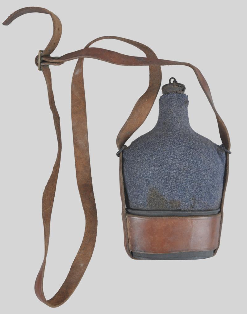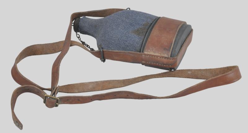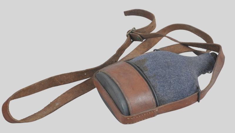 A 1 Litre French waterbottle carried as part of the officers field equipment this piece dating from 1915 with horison blue cloth as per the M1915 uniform issue. Leather carrying strap intact.