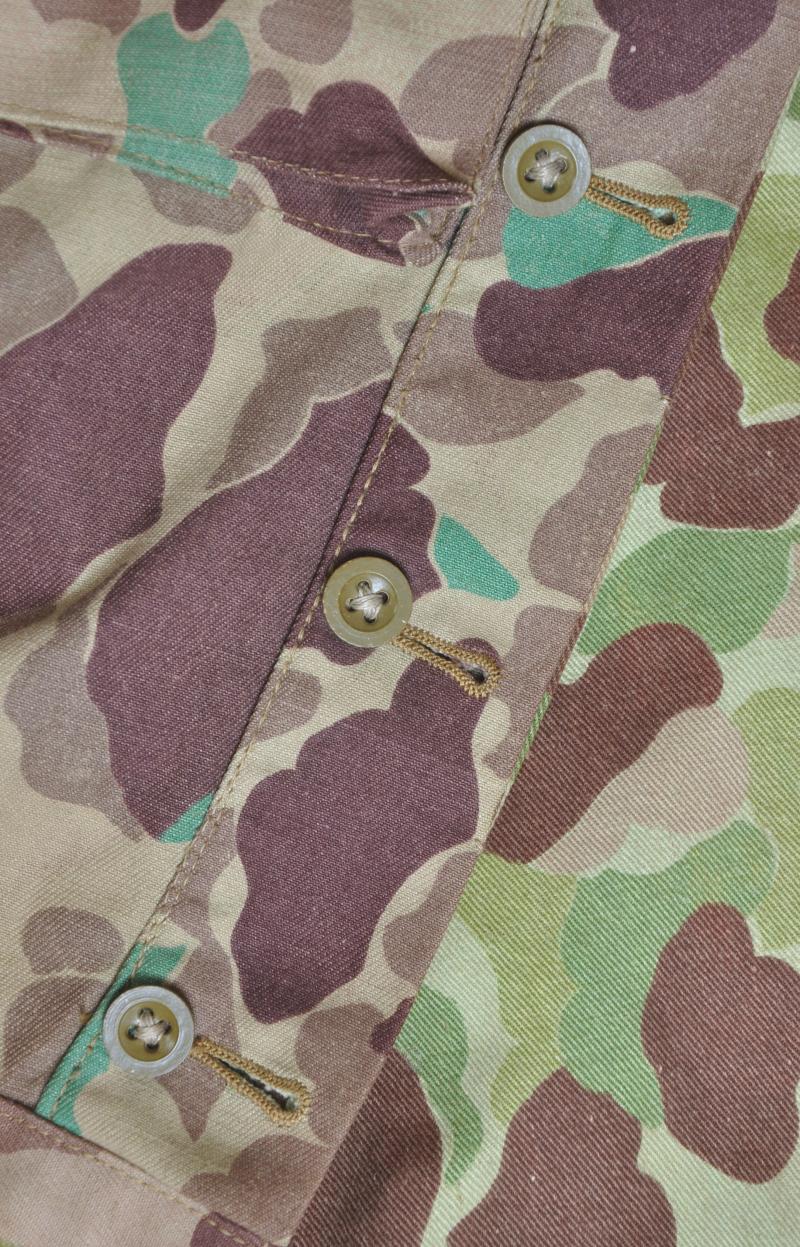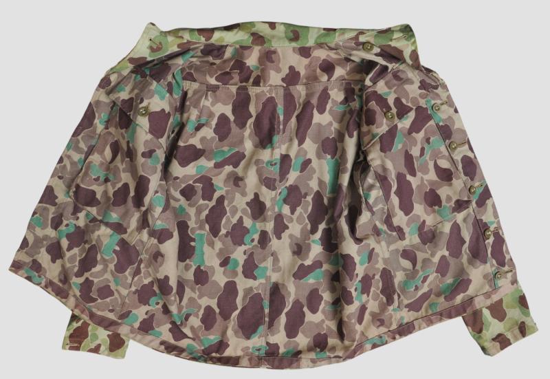 Rare camouflage smock as worn in Normandy by members of the US 2nd Armoured Division. This was part of the 'Suit, Snipers, U.S.A, E.T.O' as stated on the label & manufactured by 'Denham (1933) Ltd' in 1944. Made in the UK for use by American Forces the size is stated as '38R'. Single breasted and manufactured in cotton drill with a double sided 'frogskin' camouflage, printed in a green/summer colour on one side and brown/autumnal colour on the other. Large chest pockets are secured with buttoned flaps (straight) and with button adjustable cuffs. This is fully reversible with pockets and buttons on both sides . This example is in excellent condition and retains all of its original buttons . No damage , rips or tears & a very rare smock.
