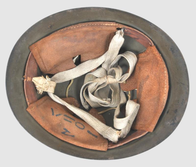 The bitter rivalry between the Imperial Japanese Army and Navy meant even in terms of procurement of what is basically the same helmet there are distinct differences ! The Navy as here only employed the larger of the two available helmet sizes . Paint and liners differed in small detail . This late war Navy version shows to the front the factory/depot stencil enamel sprayed anchor insignia that replaced the earlier separate brass and steel anchor badges . The Paint work is a finer application than Army versions and has the flat profile Navy rivets .There is a typically Navy set of kanji to one of the liner pads that is worthy of reserach. The chinstrap loops are in a fixed soldered style that is once again not found upon Army versions . The liner is the rough out hide and bears no size indication . The whole helmet is field worn with a nice patina and signs of combat use A highly evocative bring back piece .