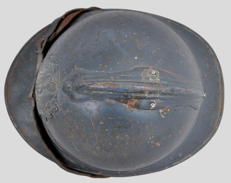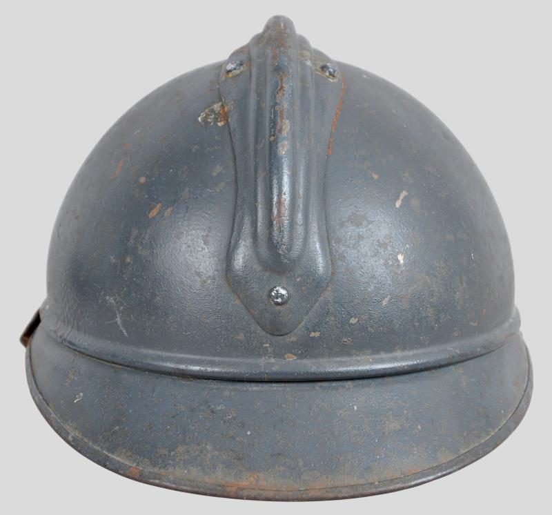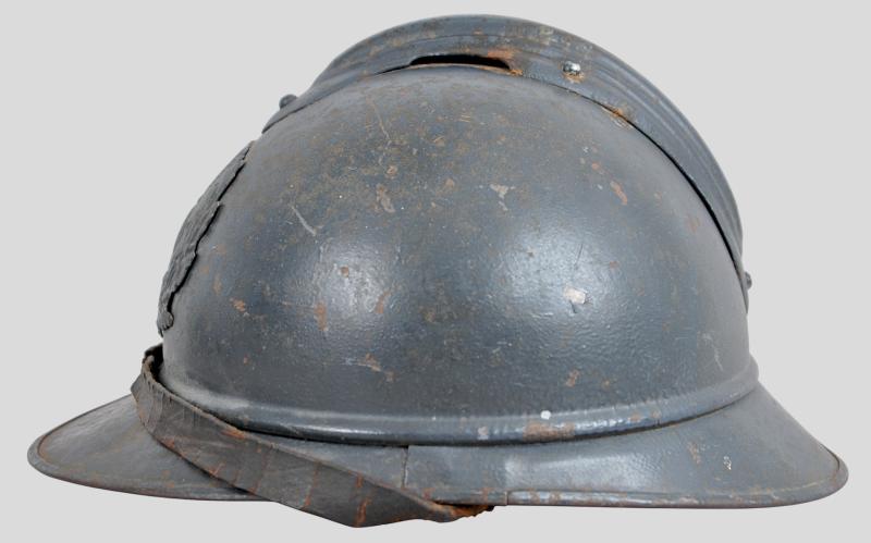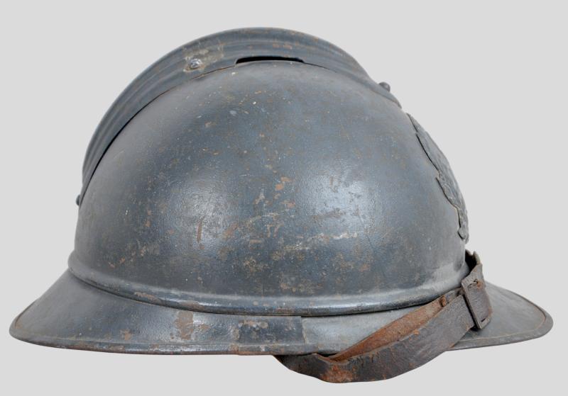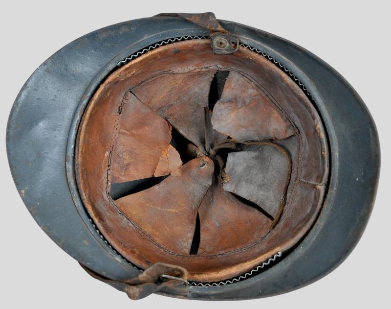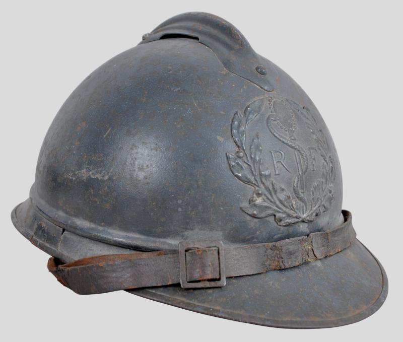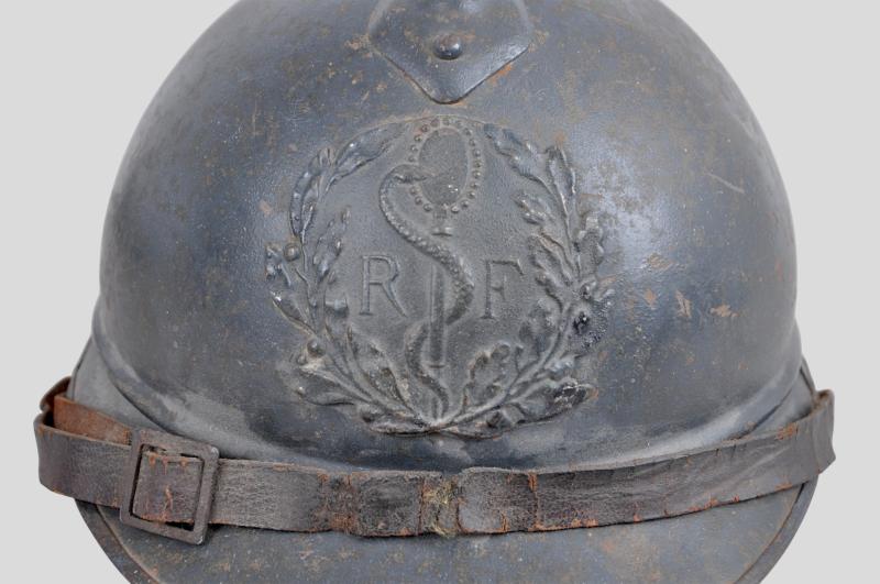 Totally untouched , this helmet displays the distinctive medical insignia to front of Caduceus with the serpent of Epidaurus encircling the mirror of prudence . This is flanked by the letters 'RF' & surrounded by a laurel & oakleaves in its entirety. This insignia was adopted in August 1915 when the War Ministry recommended issuing the helmet to medics & doctors. It is clear that the badge is totally original to the helmet with its holding pins to reverse totally undisturbed. The helmet shell retains a good proportion of its factory blue paint .Head band of the liner is in good order with corrugated metal strips to each side for ventilation still present. Complete with intact original chinstrap this is once of the scarcer Adrian helmets most likely having seen service at Verdun.