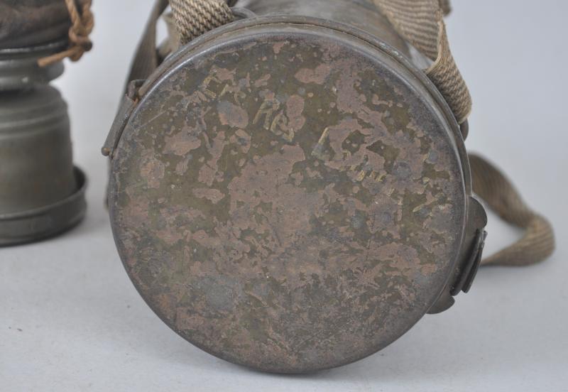 Upon the lid of the carrying tin can be seen the remains of unit markings with oil impregnated facepiece of the mask intended to prevent the penetration of gas. The often missing front adjustment strings are still present. Filter is dated June 1918 with '11-c-11' marking. High proportion of its grey green paint finish remaining.