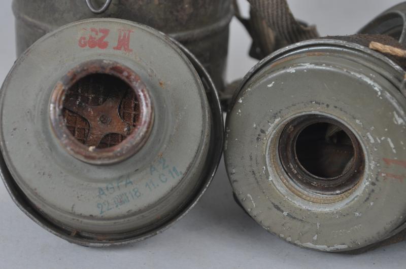 One of the best examples of the WW1 German gas mask we have had for a while this the Model 17 with ' spider' reinforcement to eyepieces & also the rare additional 'Schnappdeckel ' smoke /arsenic filter clipped onto the bottom. These were introduced in May 1918 however not many seem to have survived.