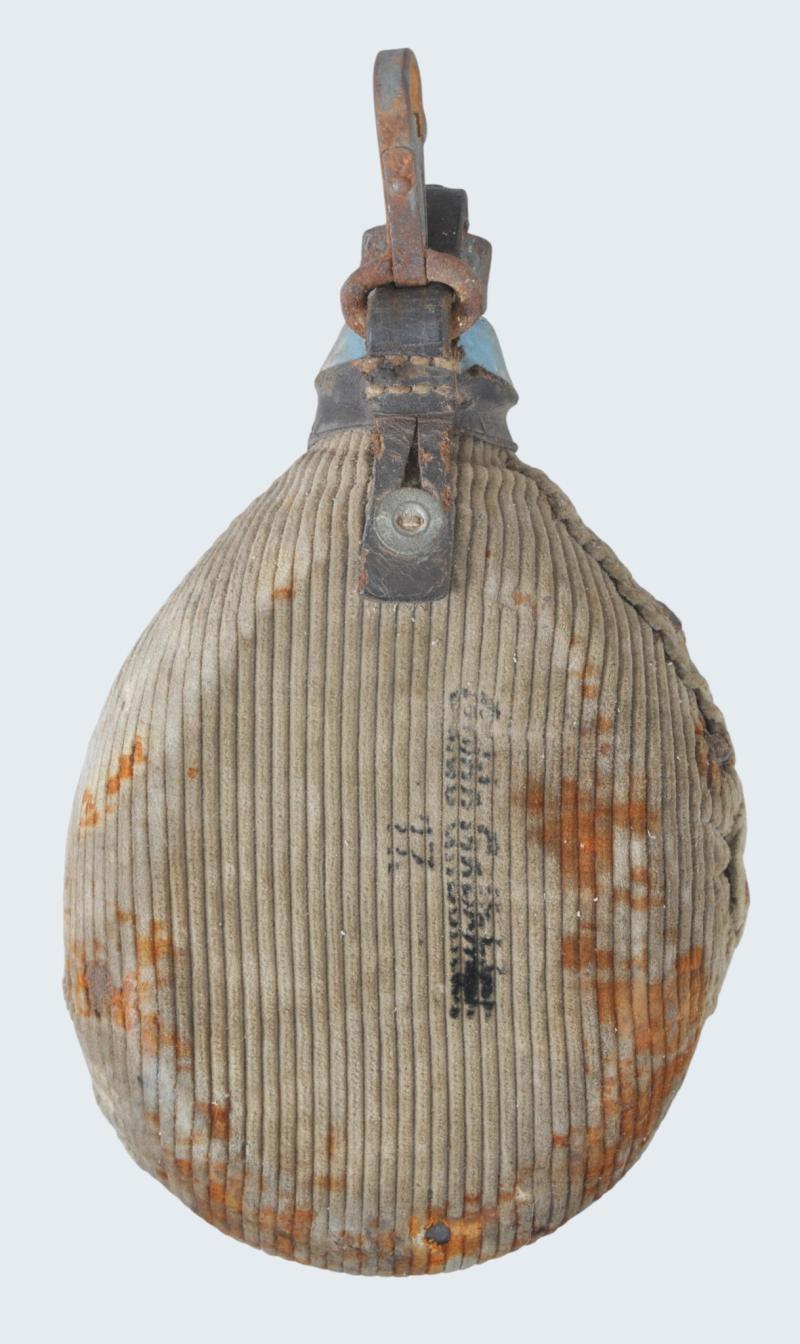 Untouched WW1 German field flask this being a blue enamel version with brown corduroy cover.
