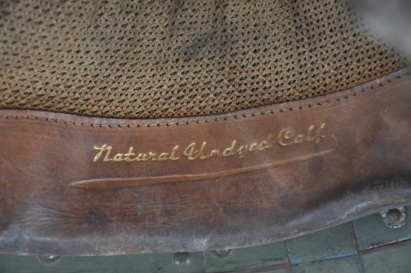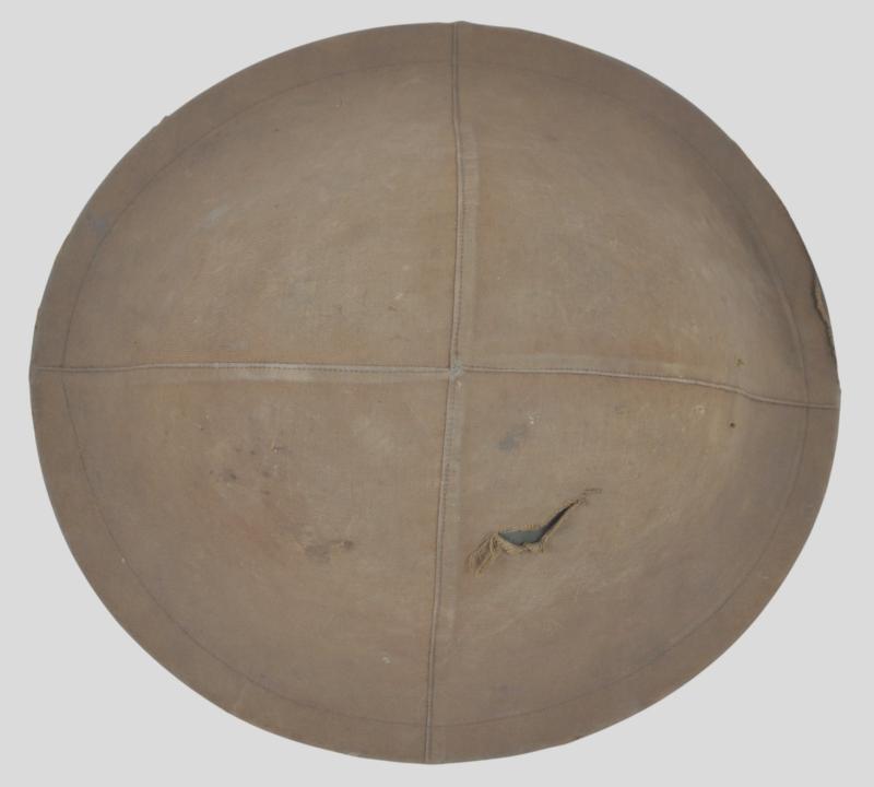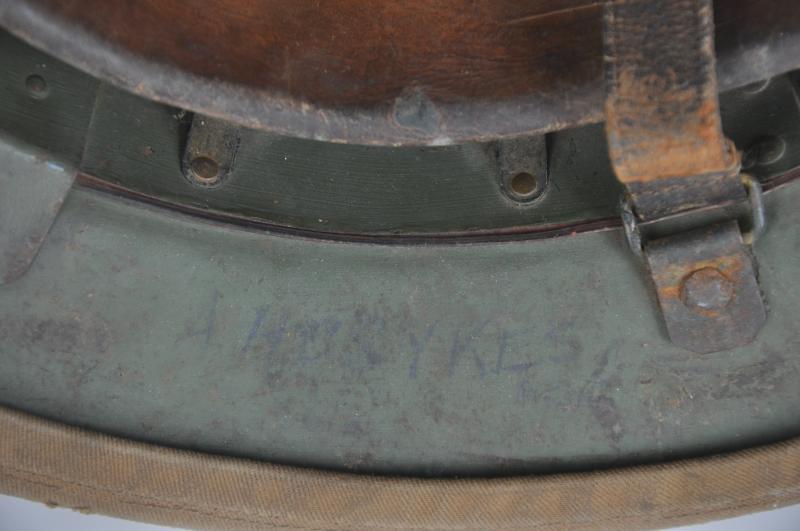 Superb example of a private purchase British officer helmet by the well known Military outfitters 'Hawkes' . Helmet shell is in the early light green typical of early productions. Hawkes provided a number of liner variations this being the four point ' Self Fitting Version'. Cover is a maker specific to Hawkes with leather reinforcing trim to interior . Two holes to front of helmet suggest previous fitment of a cap badge. Leather chinstrap intact.
