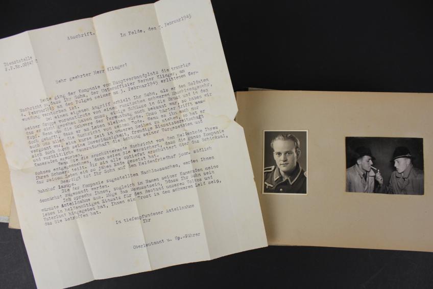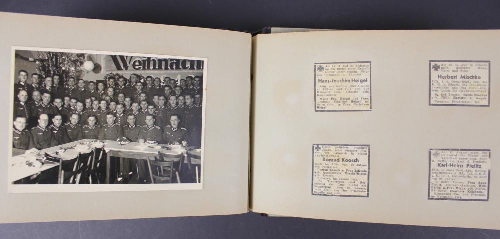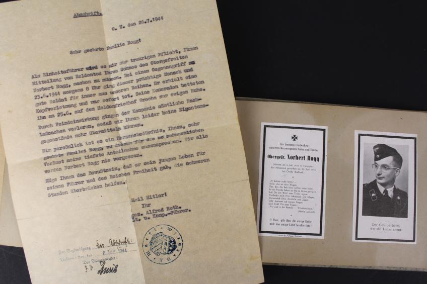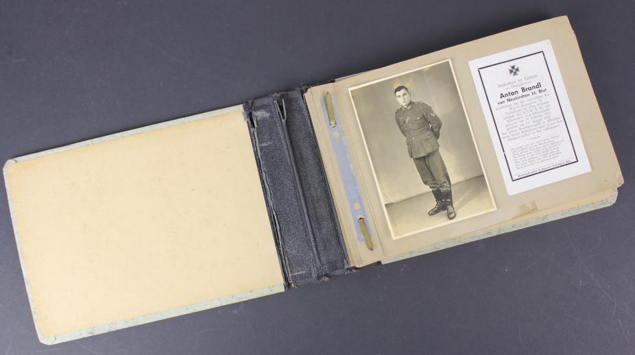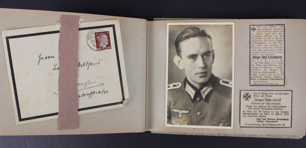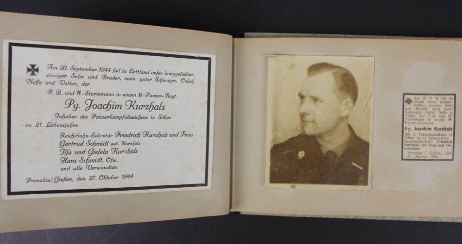 A head & shoulders shot of an SS Sturmann killed in Latvia in September 1944 with his newspaper notice & death notice are mounted on one of the double pages, there are also two soldiers that have the Commanding Officer typed next of kin letters to their families mounted in the album with them. These letters are reports to the family on the circumstances of their loved ones death. Other entries include Waffen SS soldier notices ( One killed August 1944 in Normandy ,a Kriegsmarine Leutnant killed at sea with photo & a helmeted shot of an army soldier in M36 tunic .