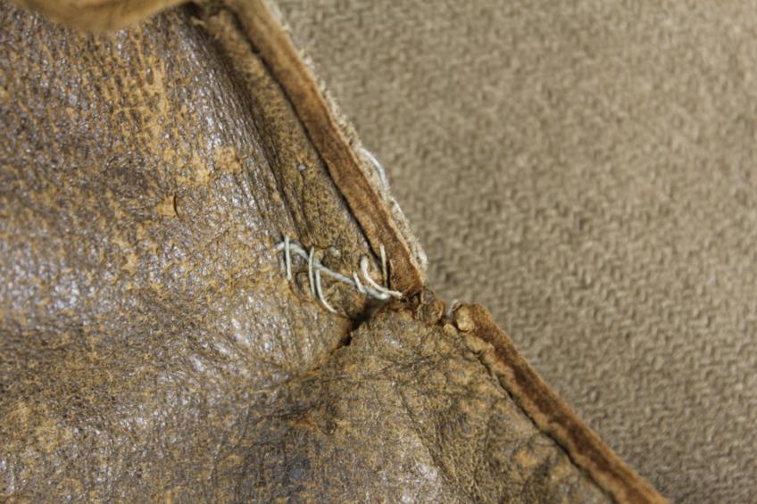 Very used example with a small half inch stress tear at the area of one shoulderpit . Patch of leather replacement to rear.